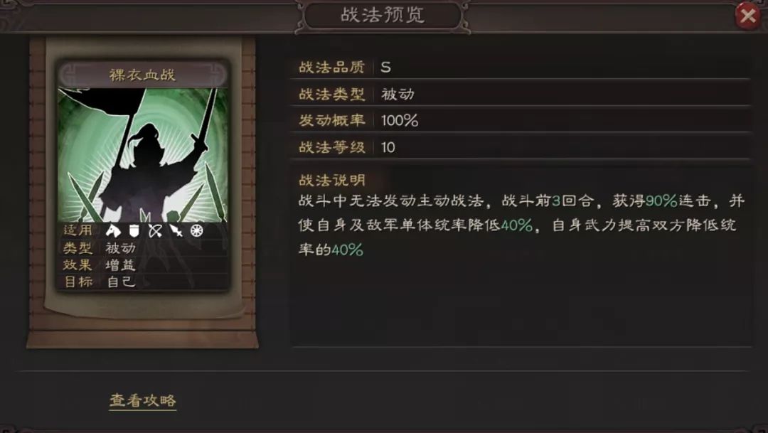 前三回合90%概率获得连击,降低自身和地方随机单体40%统率并提高双方降低统帅值40%的武力。