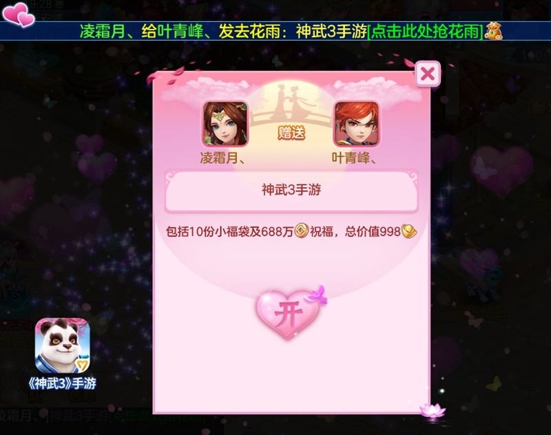 七月七日长生殿,夜半无人私语时!又是一年七夕至,为亲朋好友奉上情谊满满的节日贺卡,与他们一起分享节日的快乐!活动期间,每位少侠每天可以给好友送出3张贺卡,赠送花雨后,双方可增加99友好度,并能获得3小时花雨缠绕光效。与此同时,原世界祝福替换成花雨,全服少侠都会观看到华丽花雨,共同见证真情。
