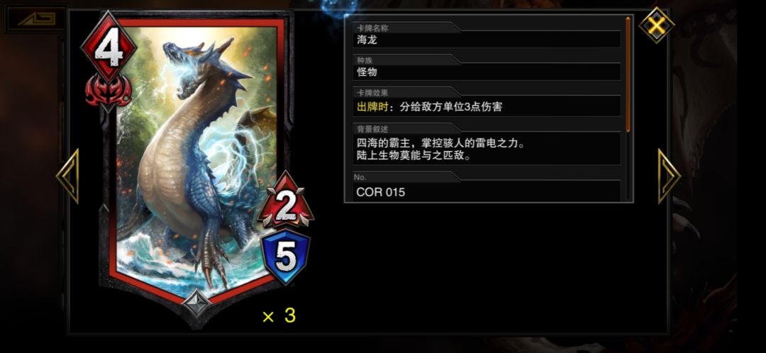 4费2-5身材有点小亏,但是其卡面效果是可以分配三点伤害给对手,情况危机时有奇效,不建议开场就下。与5费史诗红卡突袭2-6打4点伤害相比主要是海龙费用低一点,就算有mp加速回复也尽量低费比较好,而且打3打4还是随机分配的情况,大多数情况都差不多。