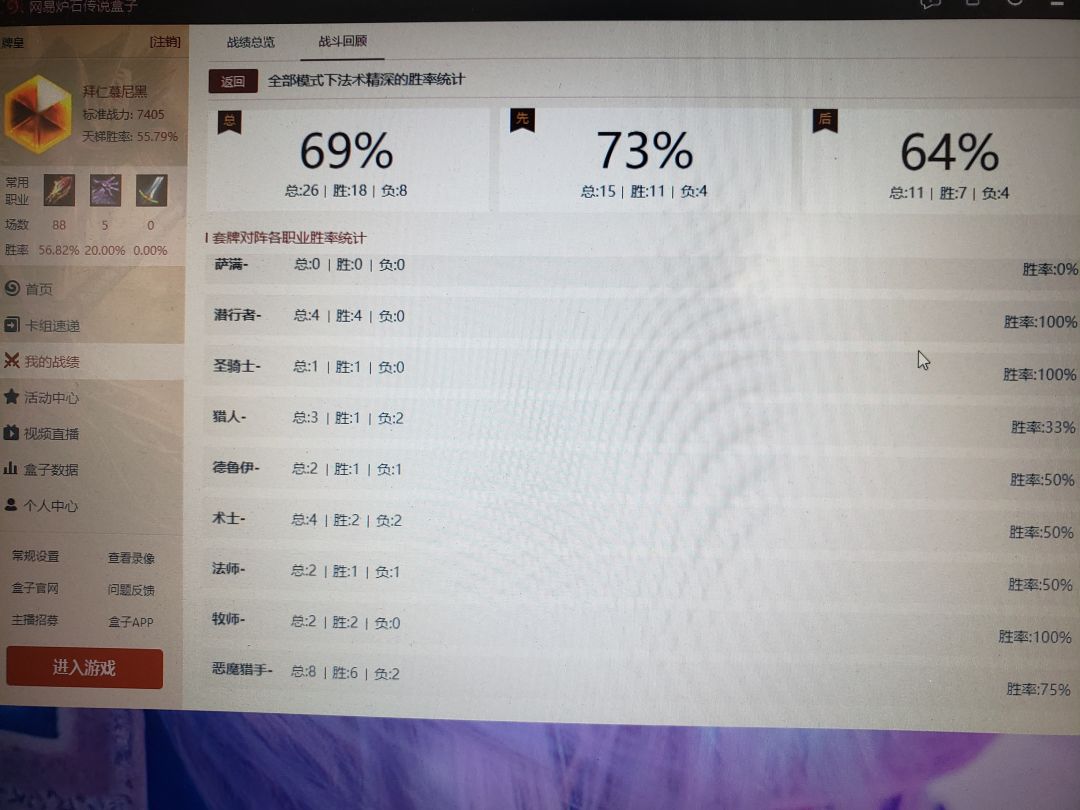新版本天梯奖励十分丰厚,给喜欢玩法师且在为上传说而努力的朋友分享一套胜率还不错法术法,新版本我用这套牌从钻石上到传说。当前版本dh是天梯大头儿,法师的冰系法术不论是冻脸还是控场都很不错,用冰甲护住脸,然后用直伤打死对面。祈求术的数量也很多 ,起手先找咒术洪流 ,主要为直伤法术减费,压低对面血线直伤一轮斩杀,尤其要注意jk红龙两波铺场。对阵法术德也要找洪流,而且冰环和暴风雪手里只有一张时不要乱用,控住场面直伤砸脸。这套法术法的直伤很高,减费后能够一回合空场打出20多点伤害:炎爆+火球+双寒冰箭。希望有所帮助,都上传说拿橙卡。