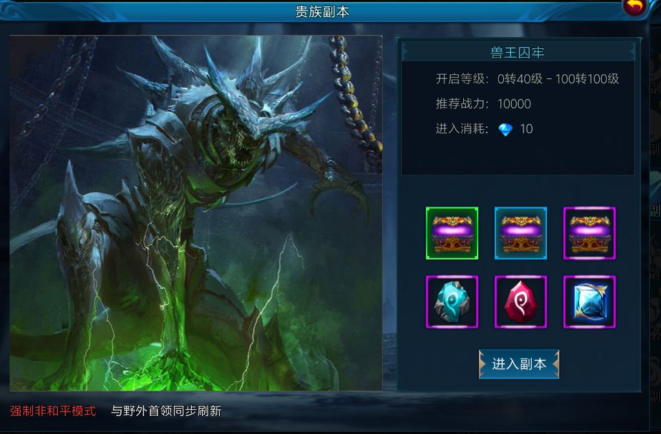 全天开放,准入等级VIP3,所有参与的玩家进入一个副本,副本中的怪物会掉落大量的装备和各类晶石,副本中的玩家可以进行PK来抢夺怪物掉落。