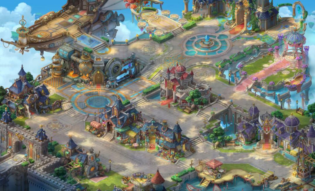《时空之塔》 采用了日系幻想的美术风格,为玩家打造了一个Q萌治愈的冒险世界。和煦的阳光星星点点散落在莱茵城的各个角落,说不上很大的莱茵城里,建筑却是各式各样。