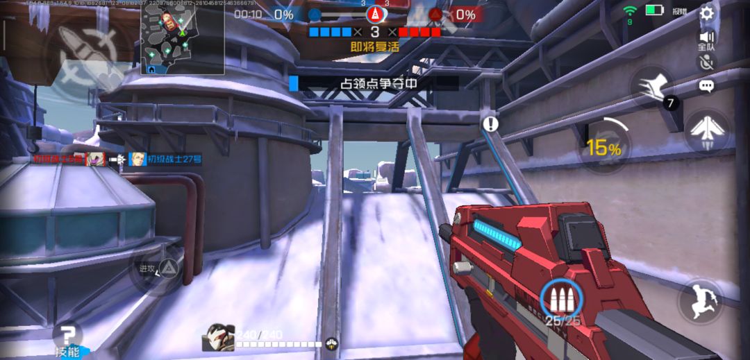 等到大招攒满,就飞到敌方出生点上方等对面复活后偷袭,一个大招下去起码死两个,那么这一波起码又能压住20秒。据点里面时间非常重要。