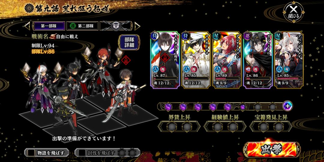 后期珠子会缺,然后前期建议囤一点。顺便50级之后升级会很慢。建议去八百屋买个战斗经验心得。然后记得刷本。还有日替挑战修炼场啥的。刷本看看可以拿到的道具,建议开宝箱掉落加成,战斗经验加成基本不用开。宝箱会掉落概率比较小的黑箱子,是武器制作方法(也就是你可以制作新的武器)(顺便我其实主要是来秀欧(不是)顺便丢个主力部队截图。现在这个阵容刷第二部第七章已经有点压力了没法一轮过(然后许愿桃太郎我想上限突破呜呜呜,我不是很肝而且玩的时间不长,蛮腊鸡的不要殴我_(:з」∠)_)