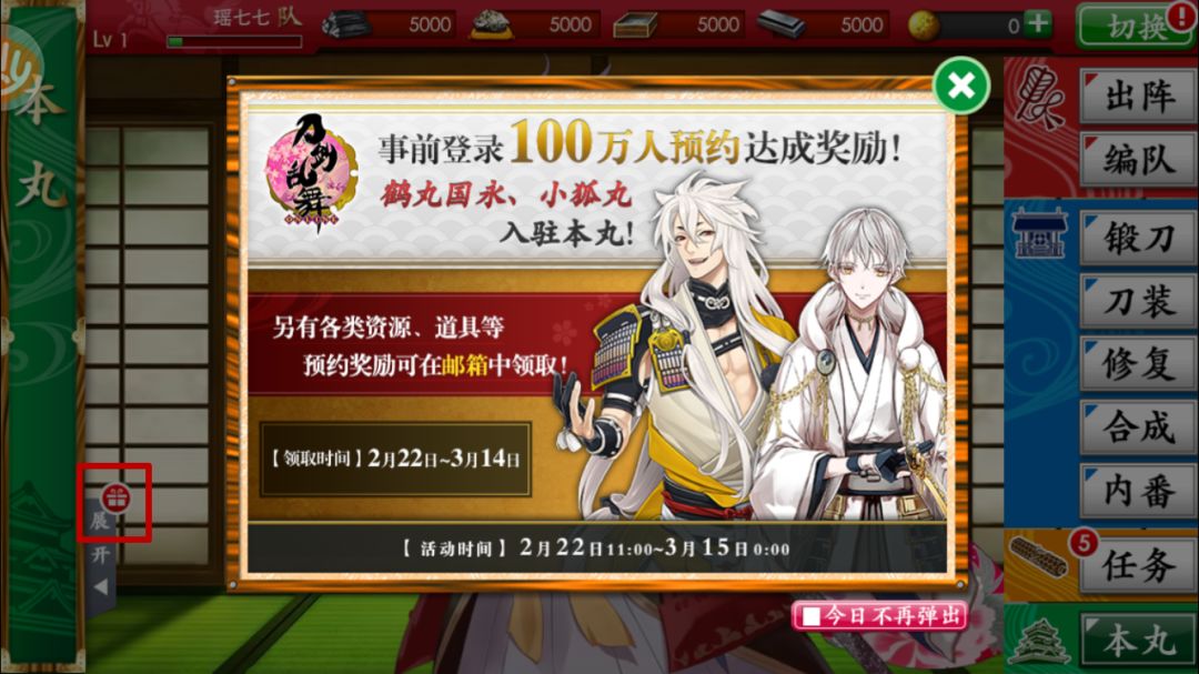 ・高亮标注:第一次选择服务器请慎重,因为游戏初始会送四花的“鹤丸国永”和三花的“小狐丸”,需要在左下角展开,上面的小礼品箱的邮件里,一键提取。