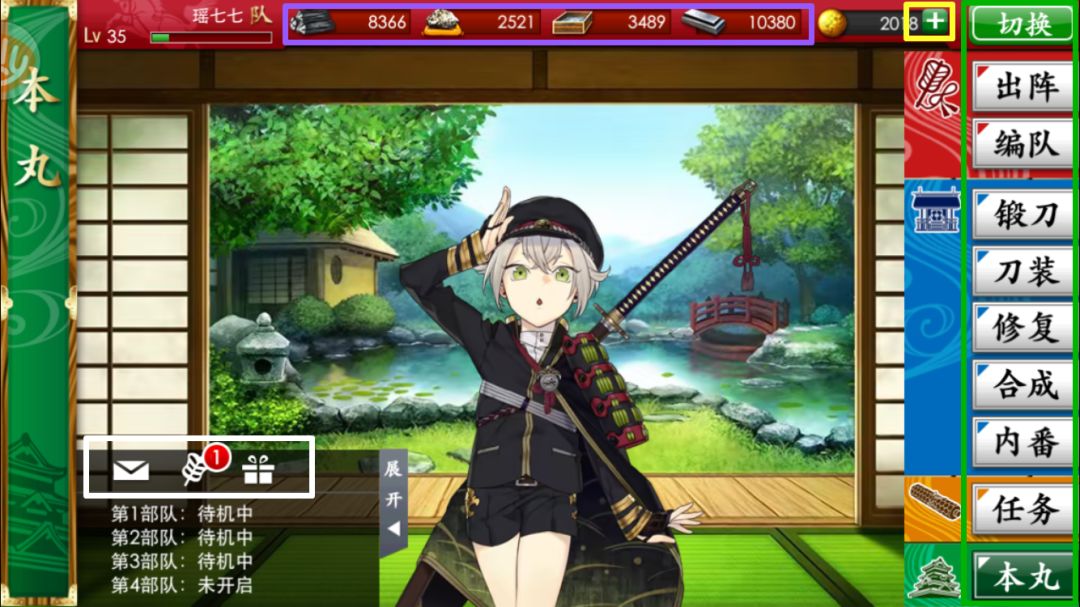 ・编队:安排刀剑男士上阵的队长、队员,管理每个角色的装备,如防御(刀装)、攻速(马)等。通过这个入口可以进行角色的管理和上锁等;