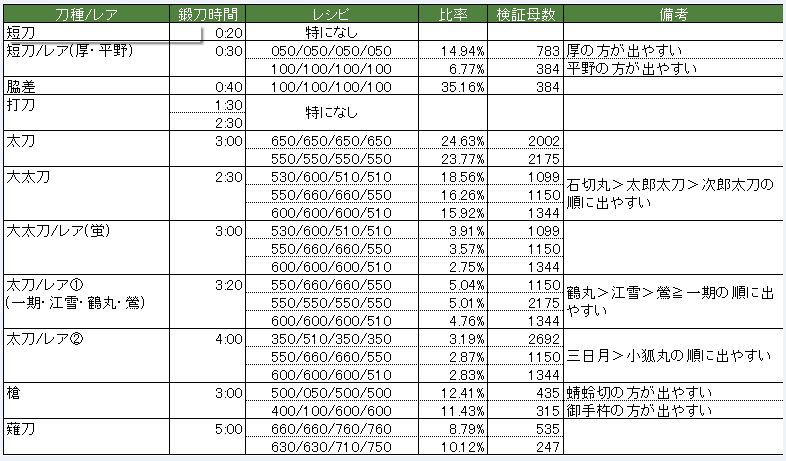 由于刀种和稀有度的原因,锻造的公式有一定的讲究,可以在http://touken.7moe.com/index.php 查看日服的锻造统计。