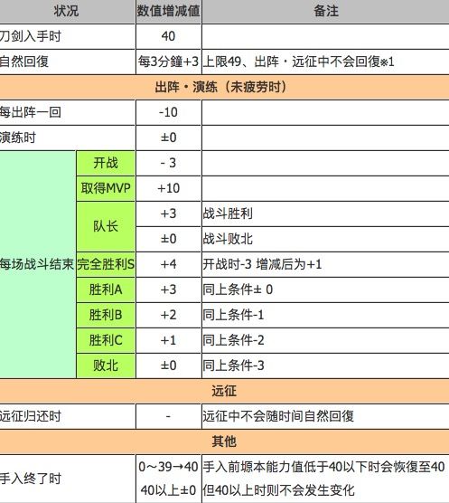 影响疲劳度的行为参见下表(转自网络,名词为日服版,手入=修复)