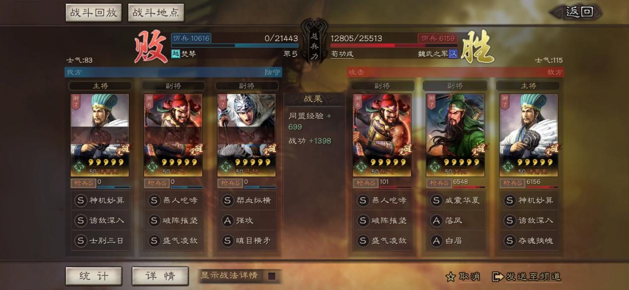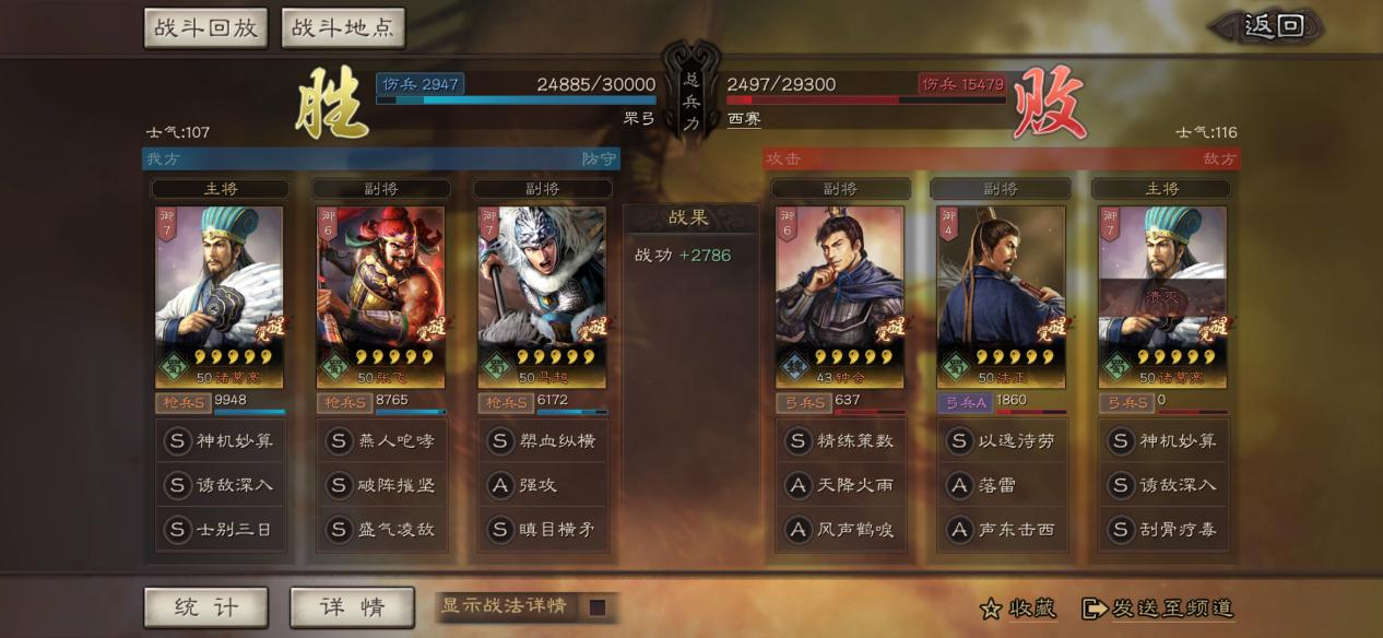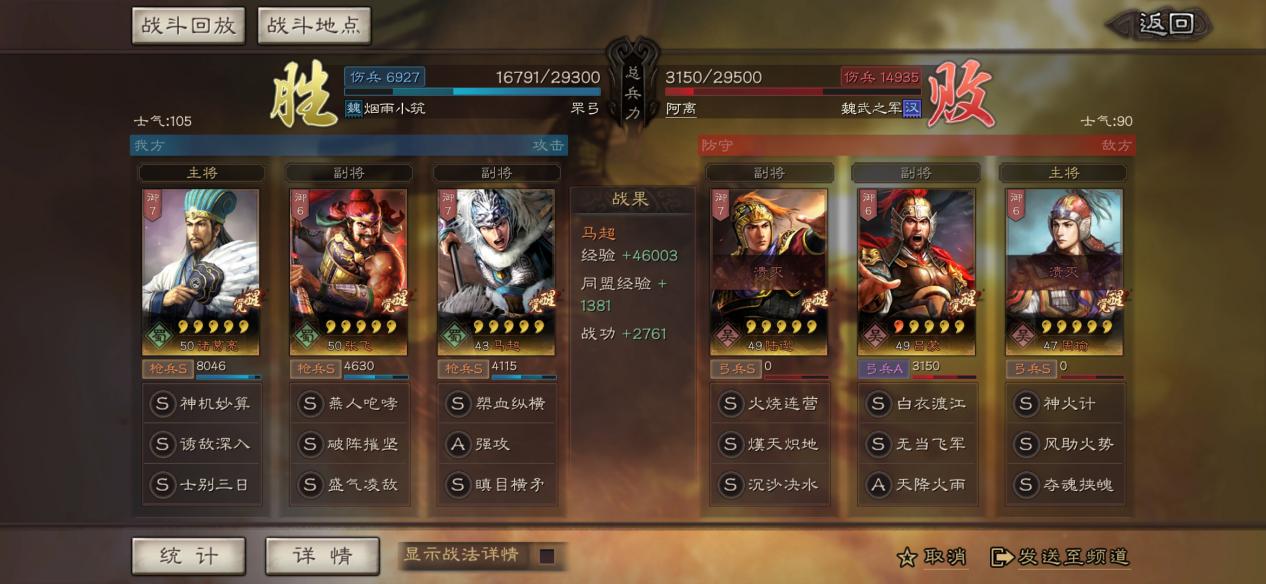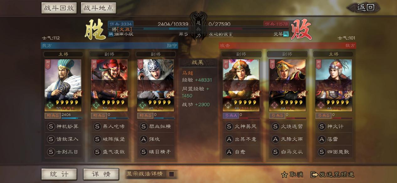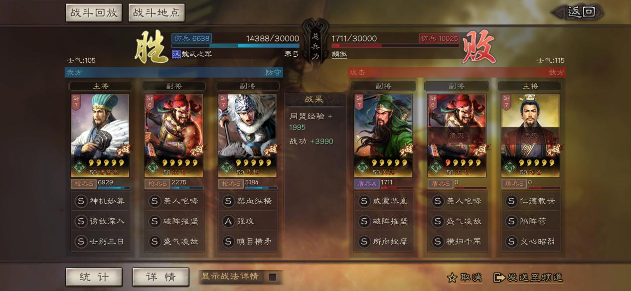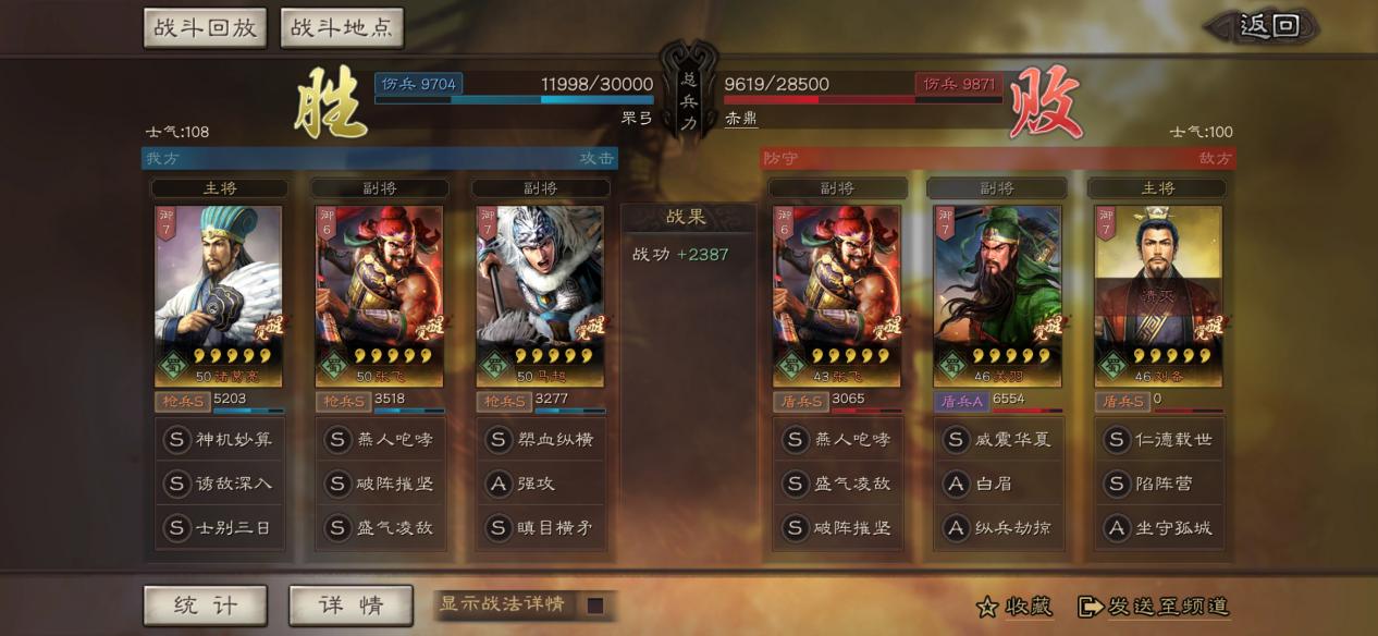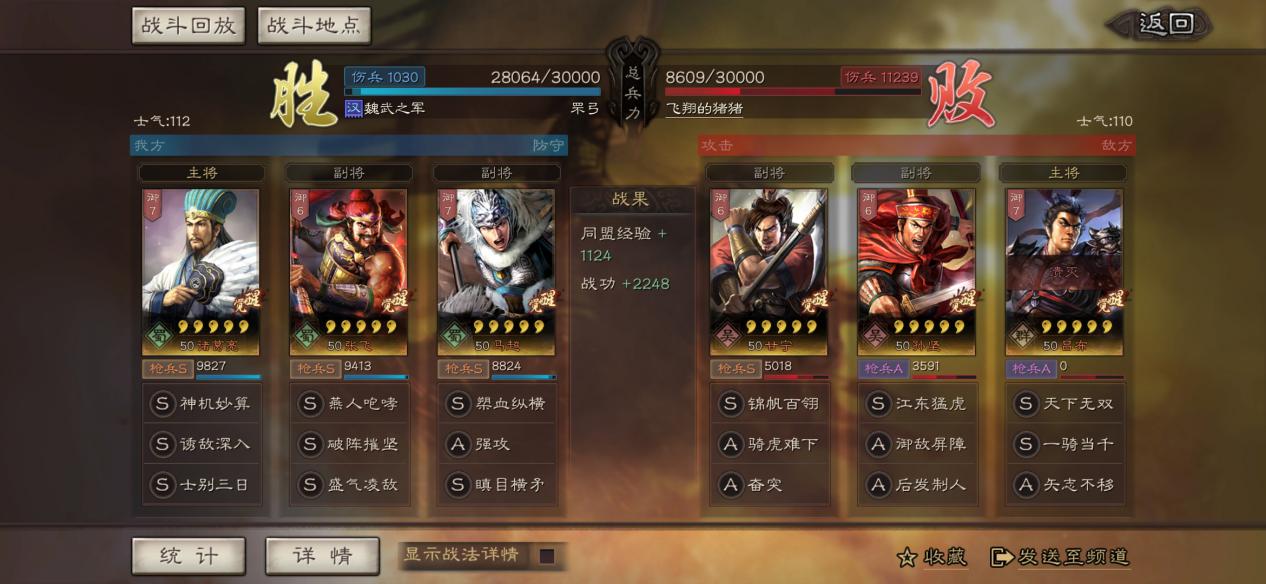 核心思路:诸葛携带士别三日搭配张飞、马超的自带被动战法,都是稳定伤害,核心体系就是稳定输出。很难出现派出3w的兵力,对方却只损耗3千的情况,即使对面脸再好,也能做到我的脸不黑,打出即使伤我一千、也要对面损失八百的气势。在诸葛“诱敌深入”的物理加伤配合张飞“破阵摧坚”的双减抗加持下,0统率0智力的情况不难出现,互为表里的配合体系下,让混伤蜀枪的战绩遍地开花。关于混伤蜀枪第三位的选择上:马超、赵云、关羽都是不错的选择。