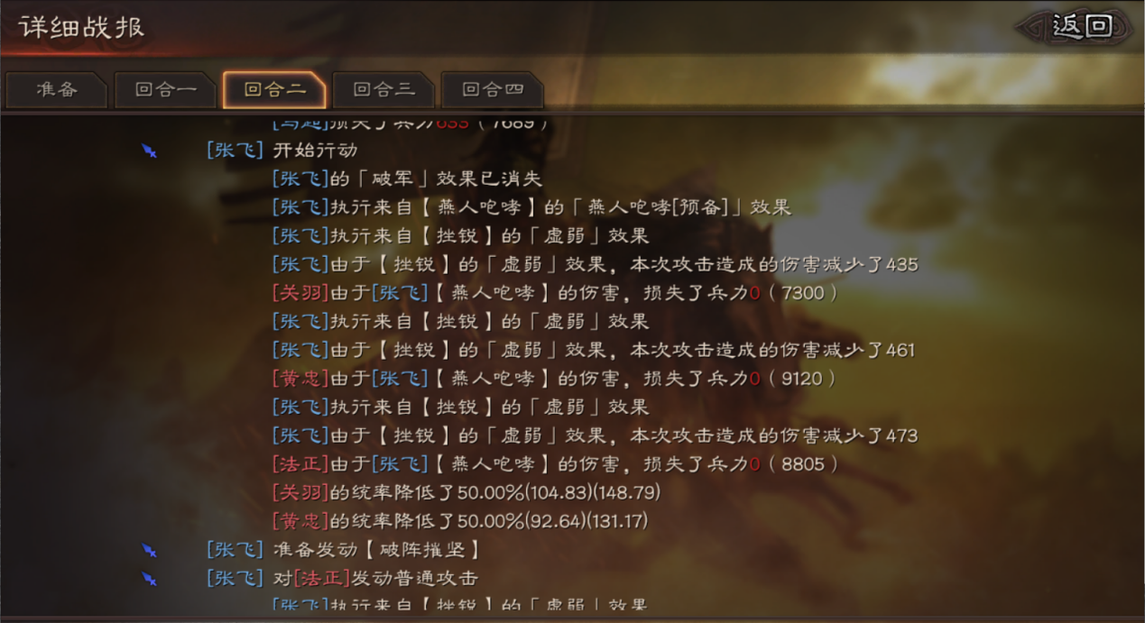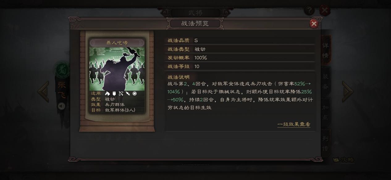 1.解析张飞的战法之前我们首先要明确一点,作为被动战法的“燕人咆哮”大多数情况下不会被打断,除非受到同为准备阶段生效的被动以及指挥类战法的控制战法(例如“挫锐”)的效果干扰,而主动战法以及突击战法的控制效果都是无效的,也就是说张飞的被动输出能力较其他输出更稳定。