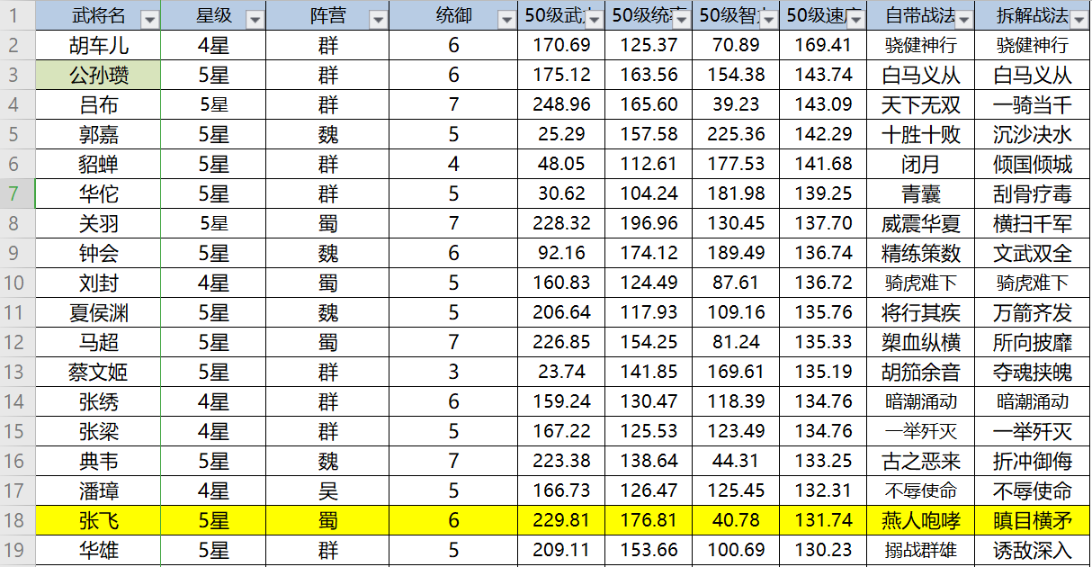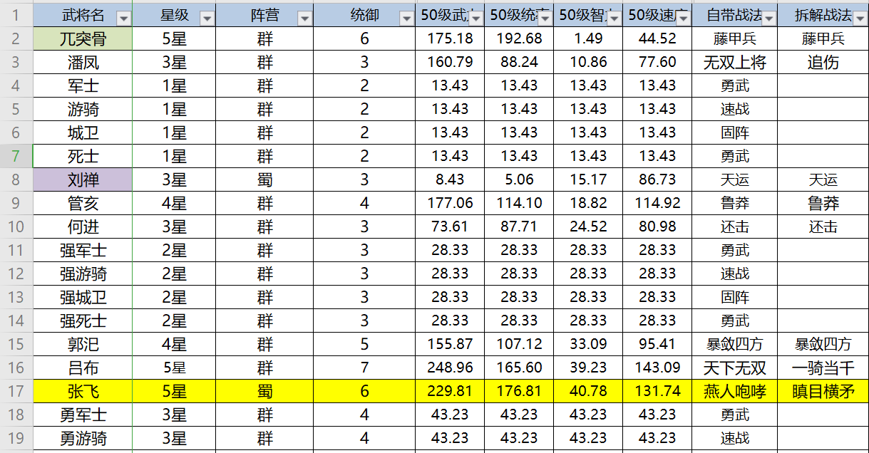 在对张飞有了一定了解之后,其高额的武力值和速度值配上稳定的高输出自带战法,再加上相对较低的统御值,成为开荒极佳的选择。