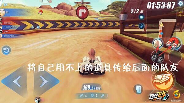 比赛时尽量用余光观察左上角,因为每一次玩家使用道具都会在那里提前预警,提前发现自己被攻击,就可以快速做出反应。组队道具赛中可以把自己的道具传送给队友,如果发现自己用不上的道具就可以传送给队友。例如自己是第一名,获得磁铁或者导弹等第一名无法使用的攻击道具,可以把它们送给排名靠后的队友,发挥它们的作用。如果身上有护盾或者天使,不要随便使用,当发现自己或者队友被攻击时再使用出来,保证自己与队友的安全。