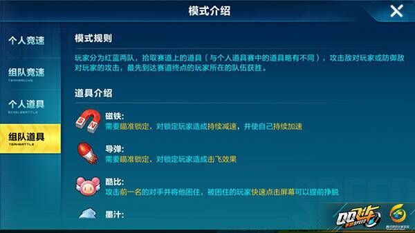 道具简介:磁铁:减速对手加速自己;导弹:轰飞对手;酷比:困住前方一名对手;墨汁:遮挡一名对手的视线;闪电:攻击领先于自己的所有对手;香蕉皮:放置一个香蕉皮,踩中者将被眩晕;云雾:在身后放一团云雾,遮蔽玩家视野;护盾:防御一次攻击;龙卷风:攻击前方所有玩家;氮气:获得加速;飞碟:减速对手。飞碟干扰器:消除飞碟减速效果;自爆:先加速,后自爆减速周围所有人;天使:保护所有队友。注:护盾与天使无法防御磁铁和飞碟。