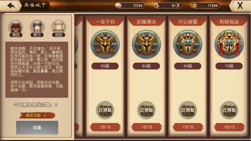 ?注意保持五将不死,少了一个都不足以在时间内完成任务,杀兵到一定数量会加时间,所以必带清兵将。兵临城下以击杀2000士兵为胜,有吕布的神豪轻松完成。没有吕布可以配置手头易得的武将。