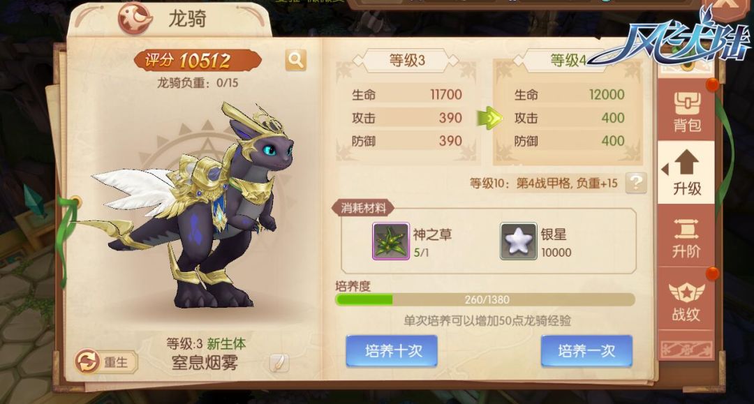 战骑可通过穿戴战甲提升实力,投喂神之草+银星培养升级,通过放入同职业龙骑或龙骑蛋进行升阶。