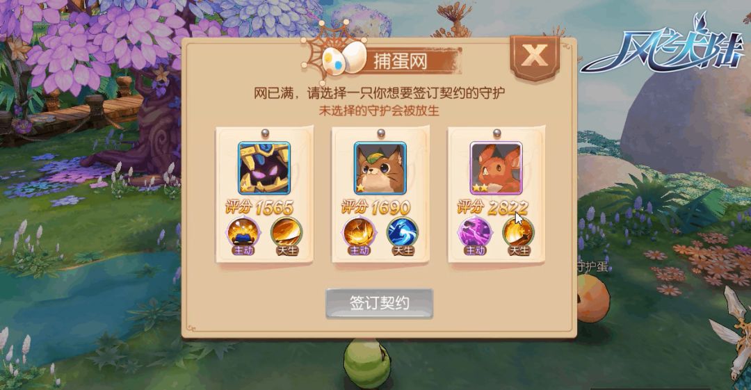 使用【捕蛋网】前往守护岛捕捉守护蛋,每个网可捕捉三个守护萌宠,可以在三只萌宠中选择一只品质最好或者自己最喜爱的宝宝签订契约,即可获得自己的守护。