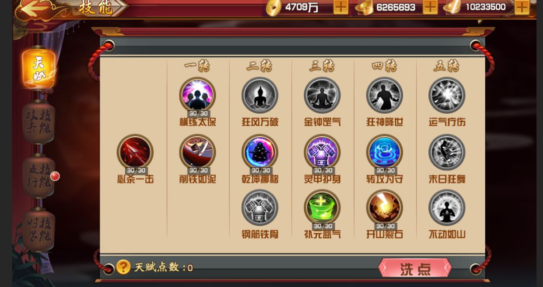 (2)技能分为一转、二转、三转,四转,五转,升天分别有6个技能。