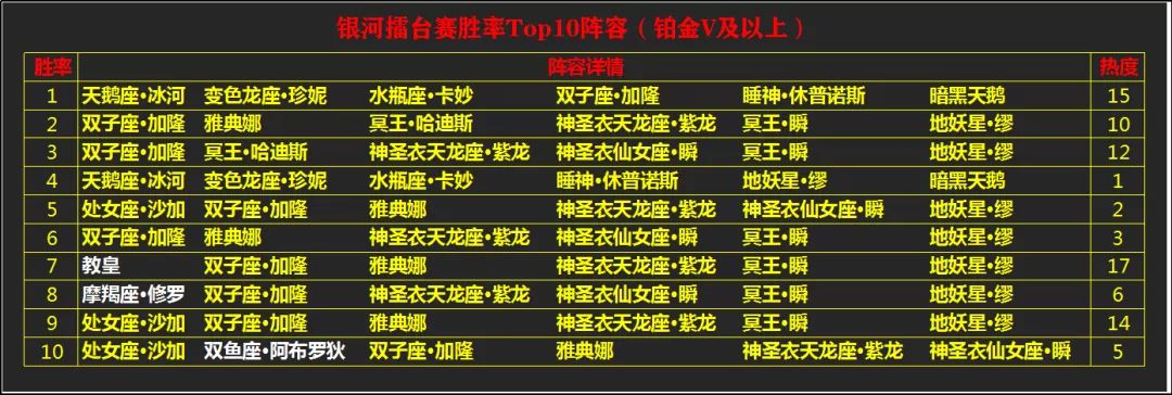 各位观众老爷晚上好,欢迎收看本期银河Top榜;不要小看赛季初,在很多人无法双ban时的对局其实比高段位双ban位要难打一些,但却能见到更多精彩的阵容。本周的top榜单中,依然是双子座加隆与神紫龙、神圣衣瞬三分天下的局面,尽管他们几个人的登场率高,不过其他队员的搭配确实千变万化,话不多说,开始本周的top阵容榜单吧!
