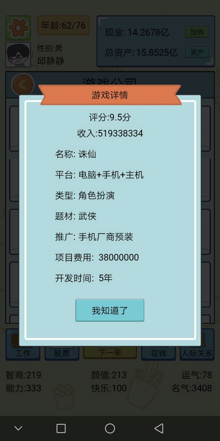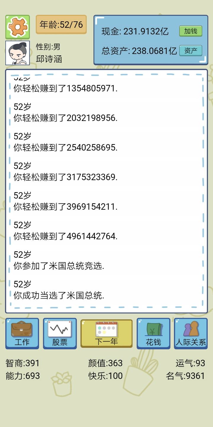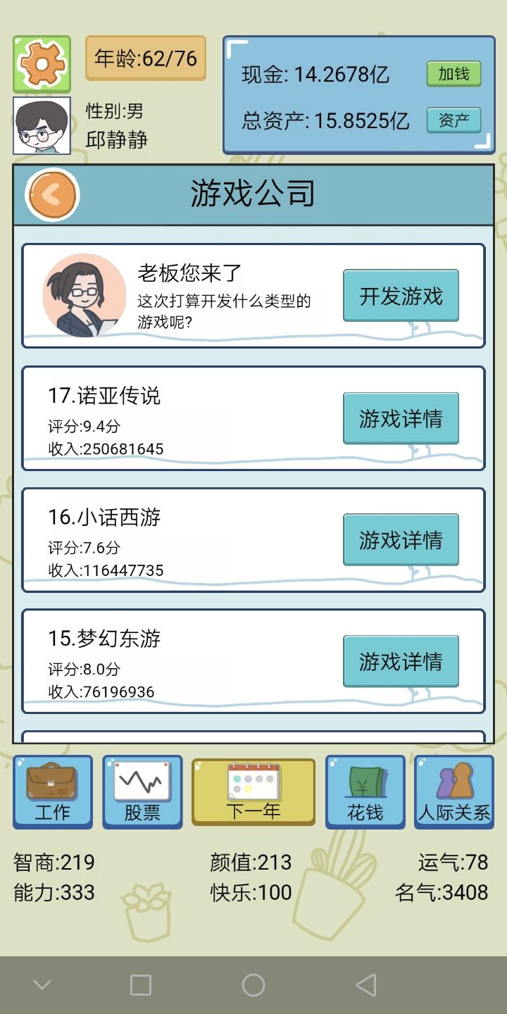 2我已经大部分玩通了,第一代辛苦些,我传了三代还是四代终于搞到二百多亿了,有时候广告加载不了,我都没敢用,一直到传代才用广告3我还试了游戏方式,选角色扮演(天赋解锁)+武侠,电脑手机主机全选,推广方式选倒数第二个,取个好听名字(我都是嫖取各大知名游戏小说名字),随随便便每次都要赚1-2个亿,疯狂刷就行了4还有所有投资不要停,一直点,基本都会投资成功。5一定要读博,毕业基础工资高,我最高的一次刷出工资几千万年薪,。6个人不建议炒股,风险大。(可能我没找到技巧,不喜勿喷)7总统没有用的。(好像是吧?)