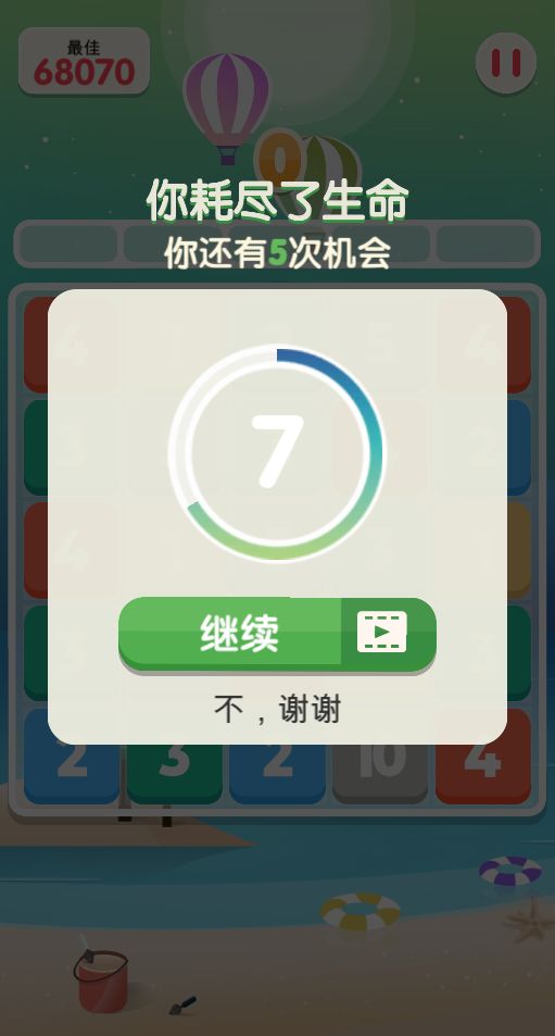 玩家耗尽生命进入复活界面,点击继续按钮复活,不点击或点击谢谢按钮则游戏结束(如下)