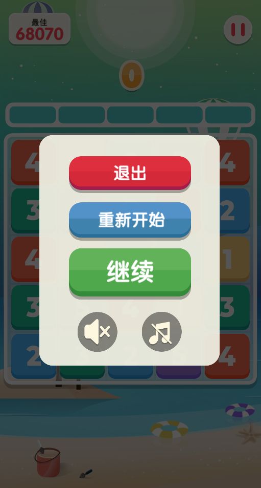 暂停按钮,点击进入暂停界面,包含退出,重开和继续功能(如下)