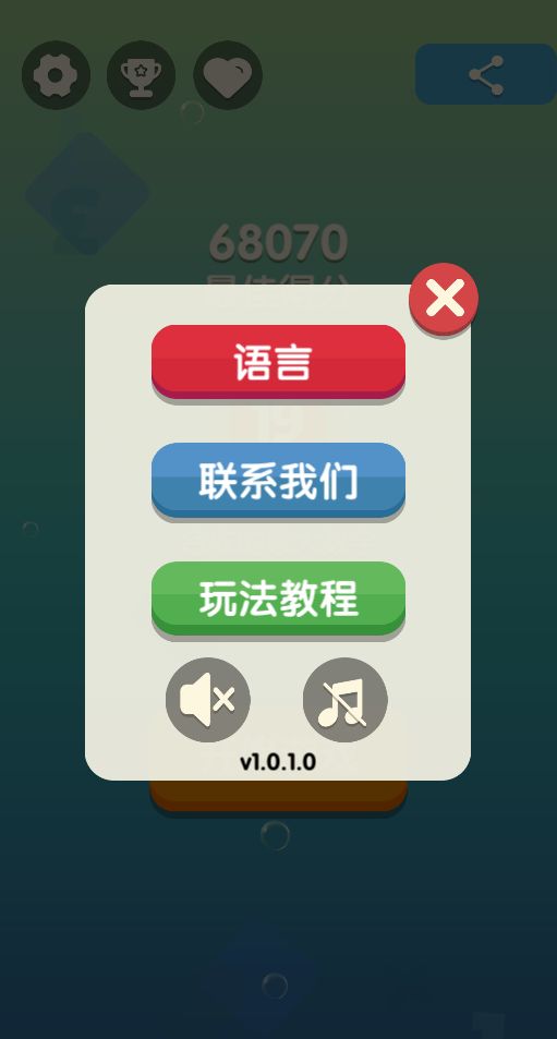 1.设置按钮,点击此按钮进入设置界面,包含语言切换,玩法教程,联系,音乐与音效开关功能(如下)。
