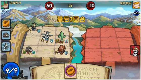 5、在第三回合中,放置一张逍遥琴师在第一排,错开中间敌方攻击的可能性,而绿洲向导成功抵挡了对方的怪物卡,让巨獾持续发育。