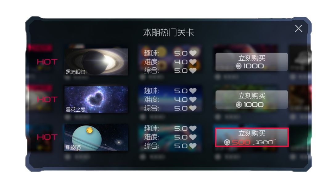 本次更新优化了宇宙之心的界面,增加了给章节评分的功能,通关的指挥官们可以给喜欢的章节打分啦,好评有奖励(最多10倍),热评的章节会优先排在所有章节的最前边。如果想要和其他大佬们‘切磋武艺’,就拉上好友一起推上热门,然后比赛吧~