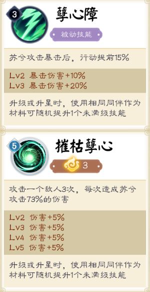 苏兮的二技能是一个很实用的被动技能,当每次苏兮暴击后苏兮的行动条会提高15%,在苏兮满暴情况下,大招可以为苏兮提升45%行动条,加快了下一次苏兮的行动时间。