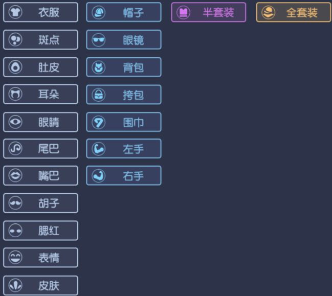 首先我们需要知道猫具体有哪些补位基因,并且这些基因都有哪些对应的颜色。颜色分类有四种,分别是白色普通基因、蓝色稀有基因、紫色更稀有的半套装基因,金色超稀有的全套装基因。其中普通基因分类有11种,含有衣服、斑点、肚皮、耳朵、眼睛、尾巴、嘴巴、胡子、腮红、表情,皮肤等。稀有基因分类有7种,含有帽子、眼镜、背包、挎包、围巾、左手,右手。半套装基因分类有1种,即为半套装。全套装基因即为全套装。