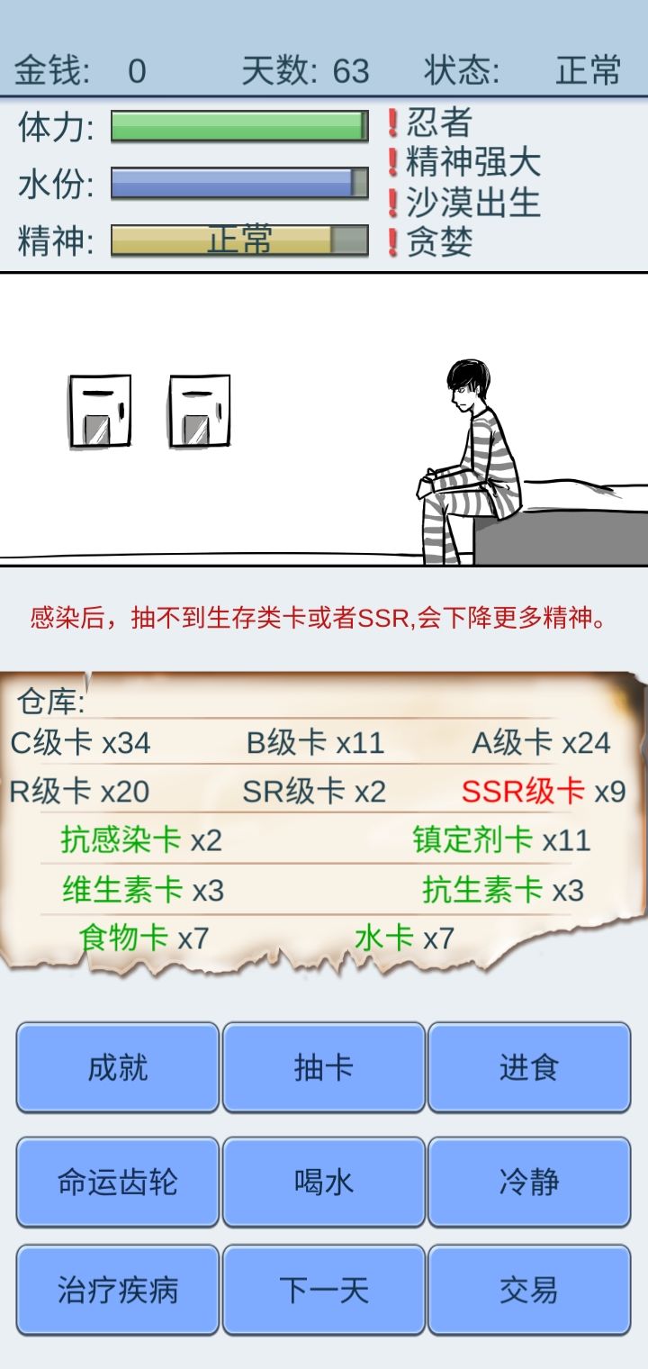 这个游戏要注意天赋,然后药物可能的话保持在两张左右,食物水源自己根据天赋考虑一下。这样至少可以生存下来。剩下的自己慢慢琢磨,努力通关游戏吧!奥利给!