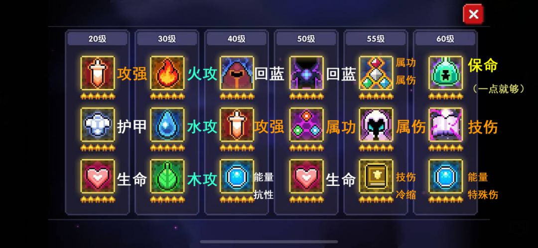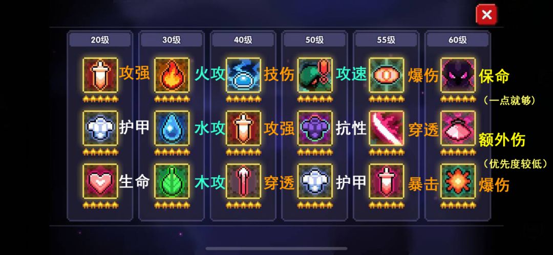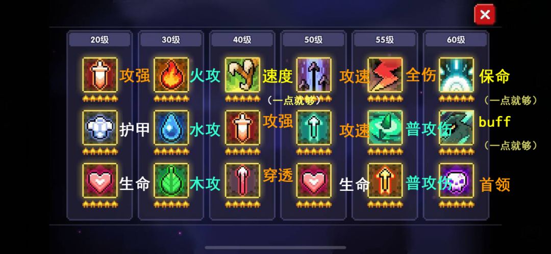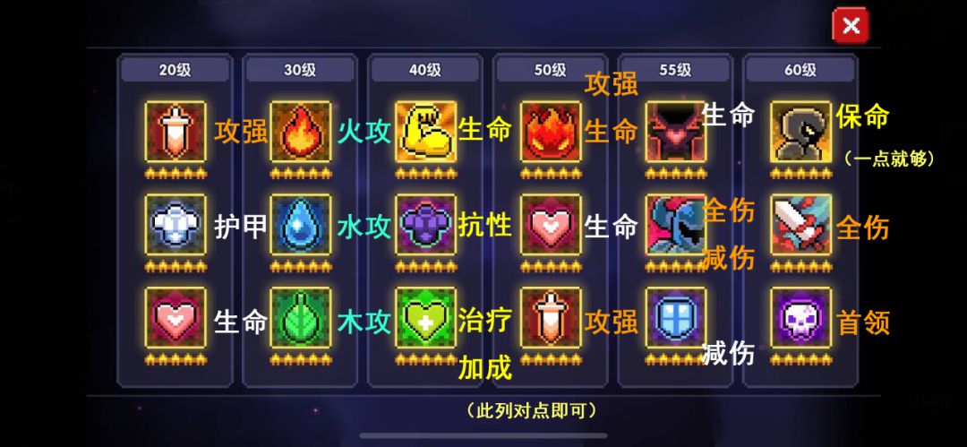 1:同一列出现多个橙色属性,则采用互点点法。(比如55级天赋第一列橙色是一星,第二列橙色是二星,当你有了足够的天赋人偶使这两者其中一个加一星级,那么优先点击第一列。即 同一列 橙色属性的星级相差数不大于 一 )