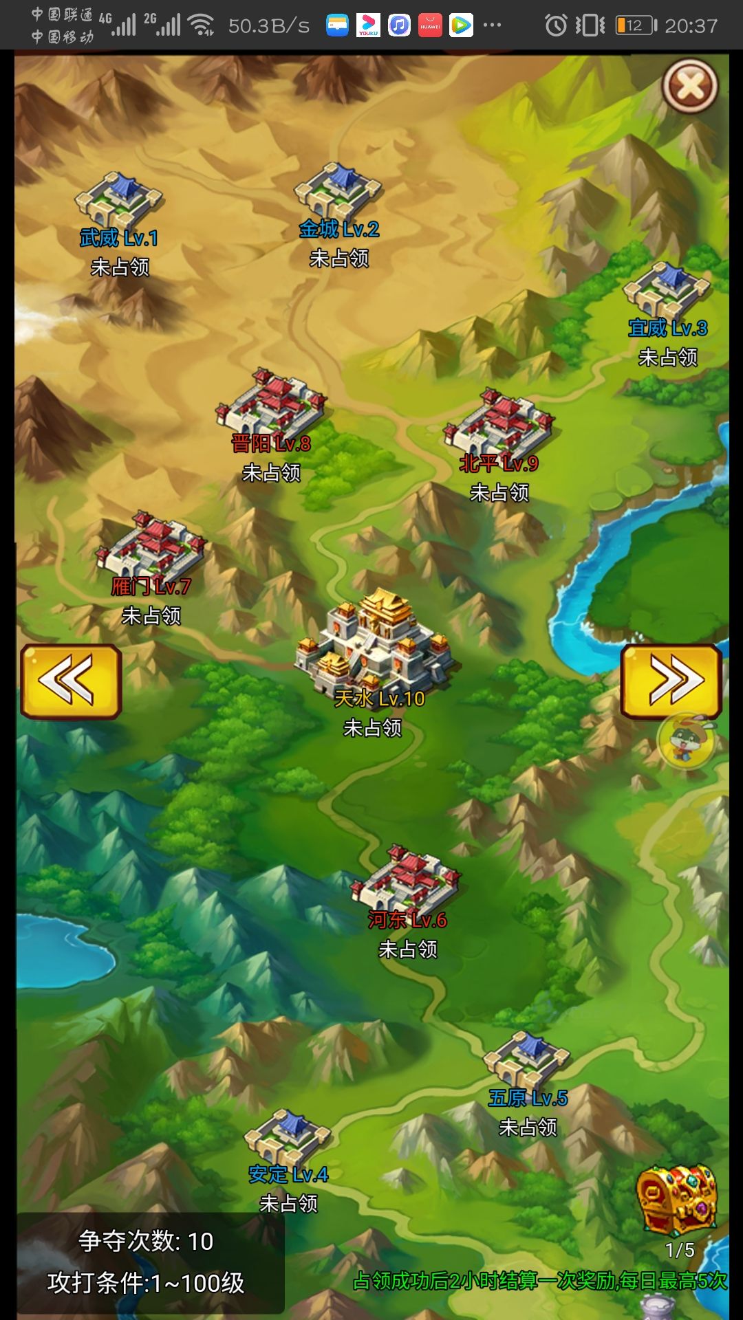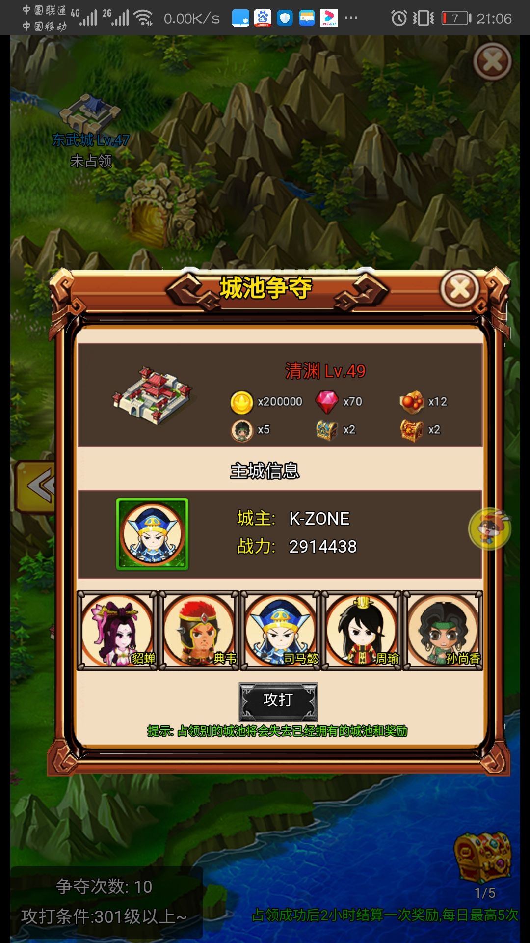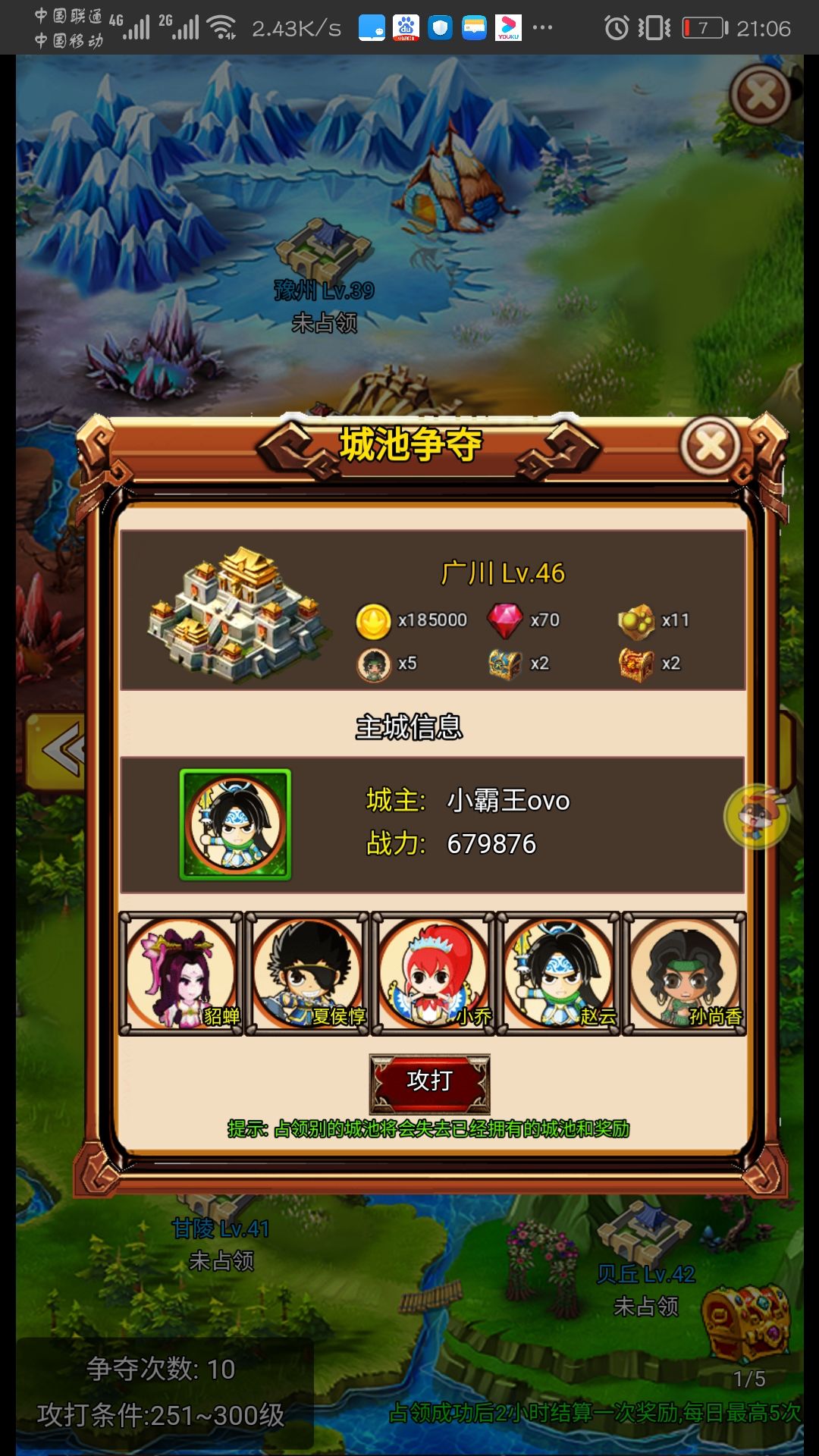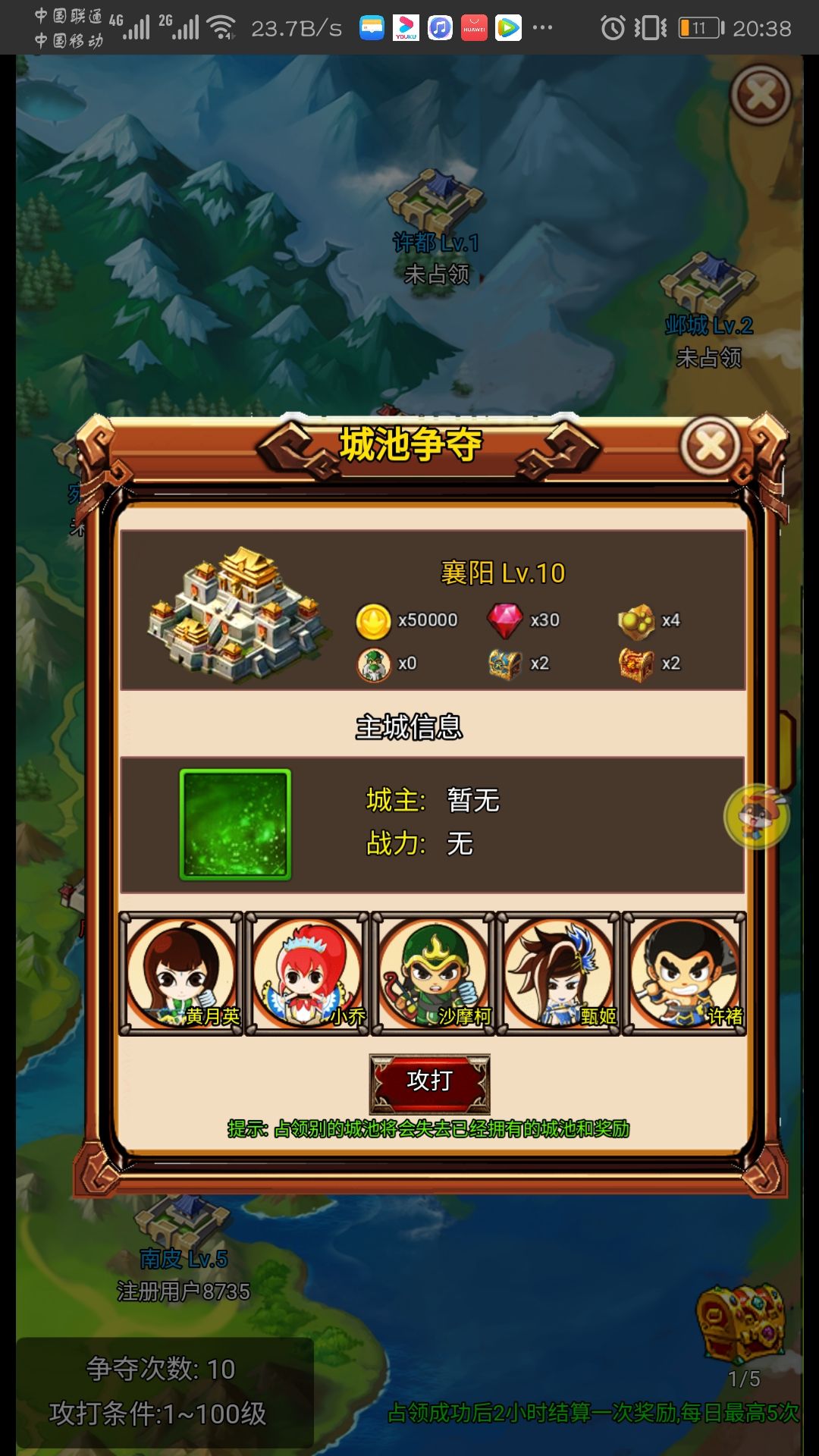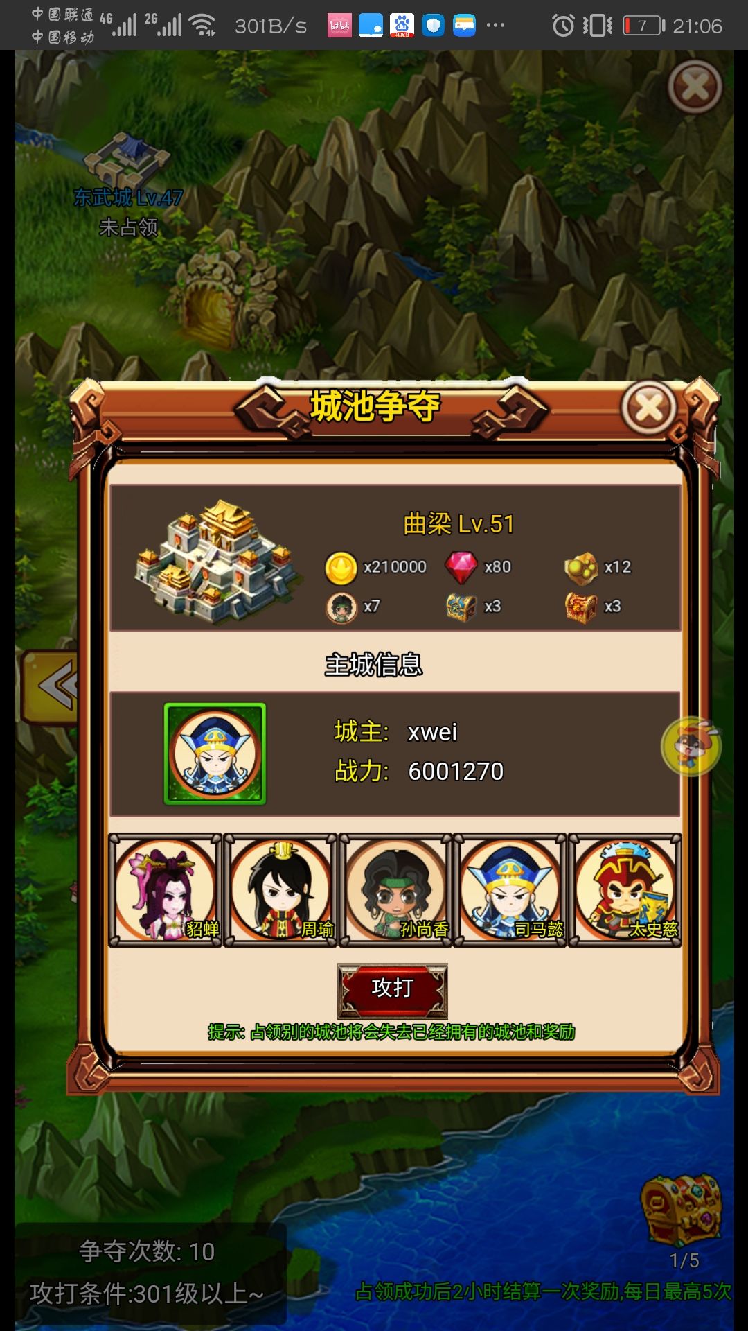 每个城池都标明了能获得的金币,钻石,药材或丹药,武将碎片,武将宝箱碎片和装备宝箱碎片。x0的不是说你占了够久他就会有几率变高,而是实打实的就是零。每两小时能拿,一天能拿五次,从你占领该城池两小时后开始算。