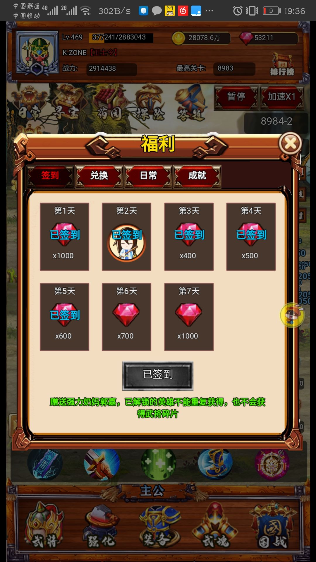 签到顾名思义,断签的会重新算(零时刷新)兑换每号只能一次,在TapTap有两个,公众号有一个,另外再给你一个“tap2000”其他的自己再挖掘下吧日常能获得功勋,经验和钻石,除了分解和洗练,其他能做的尽量做了吧,反正绝对有利无害。成就点不会因为零时没领取而消失,不必担心。获得钻石