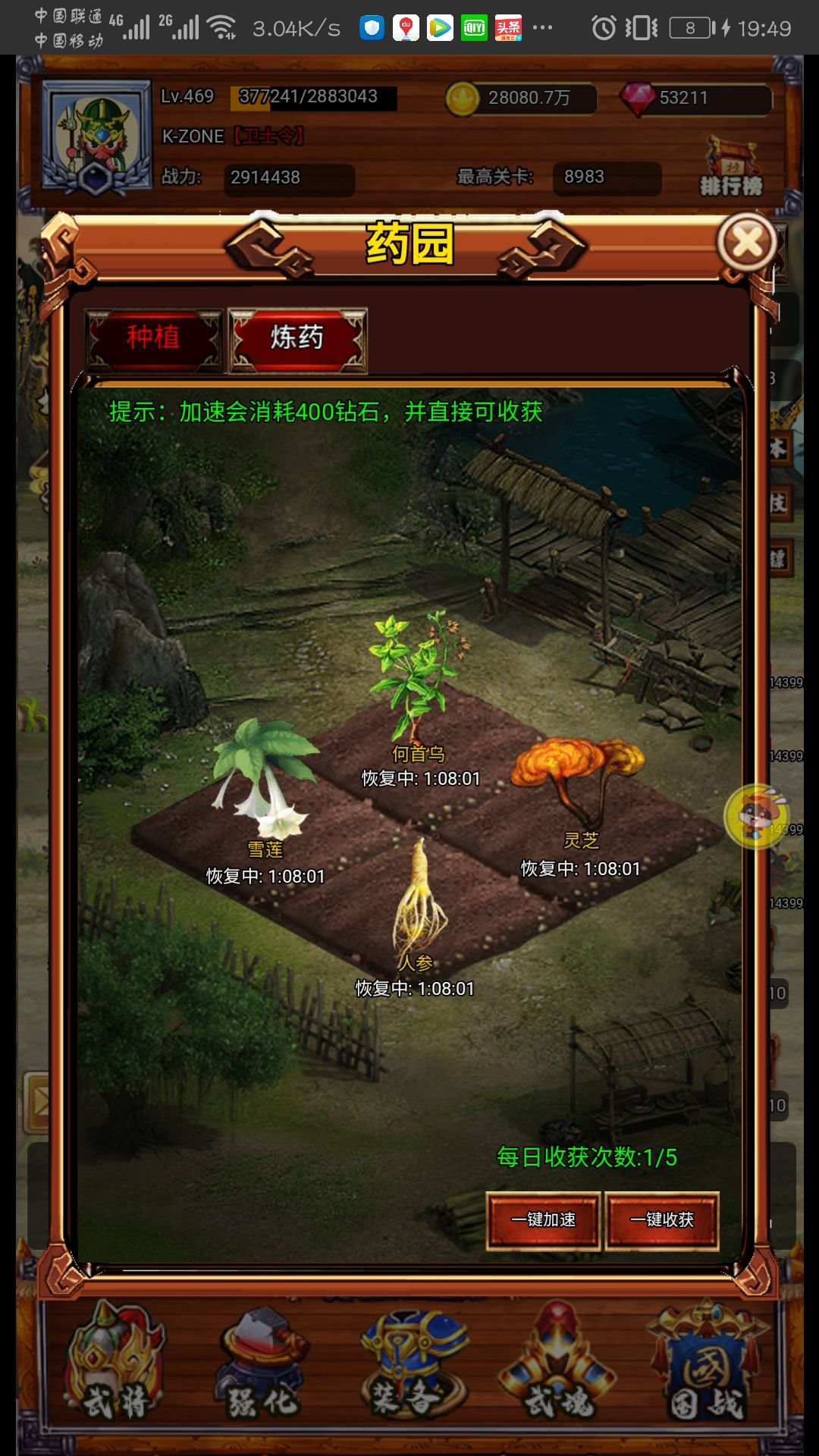 一天五次,每两小时一次,每个草药一次收15个。四种药每三种不同组合能炼药。推荐优先级为攻击>生命和防守>自回。