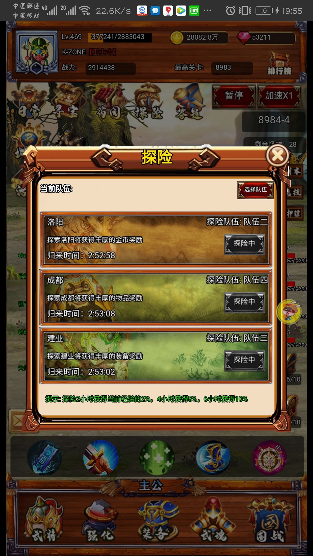 迅速开武将尽快完成三小队能快速累积资源。只有前四队有用(三幅图里面不会出武魂和钻石),回收探险队还能获得经验。经验跟时长有关。然后一二队开拓洛阳(金币),四队成都(药材,丹药和武将碎片),三队建业(装备)。金币获得跟探险队整体等级挂钩,装备应该是探险队整体等级决定所得装备上限,不是说整体等级越高出的就越高,而是整体等级高会有获得高阶装备的可能性。我来说说我探险的经验,我是七点左右起床,然后挂六小时,1点收一次然后挂四小时,五点收了再挂六小时,11点晚上收了挂六小时睡觉完成一个循环。