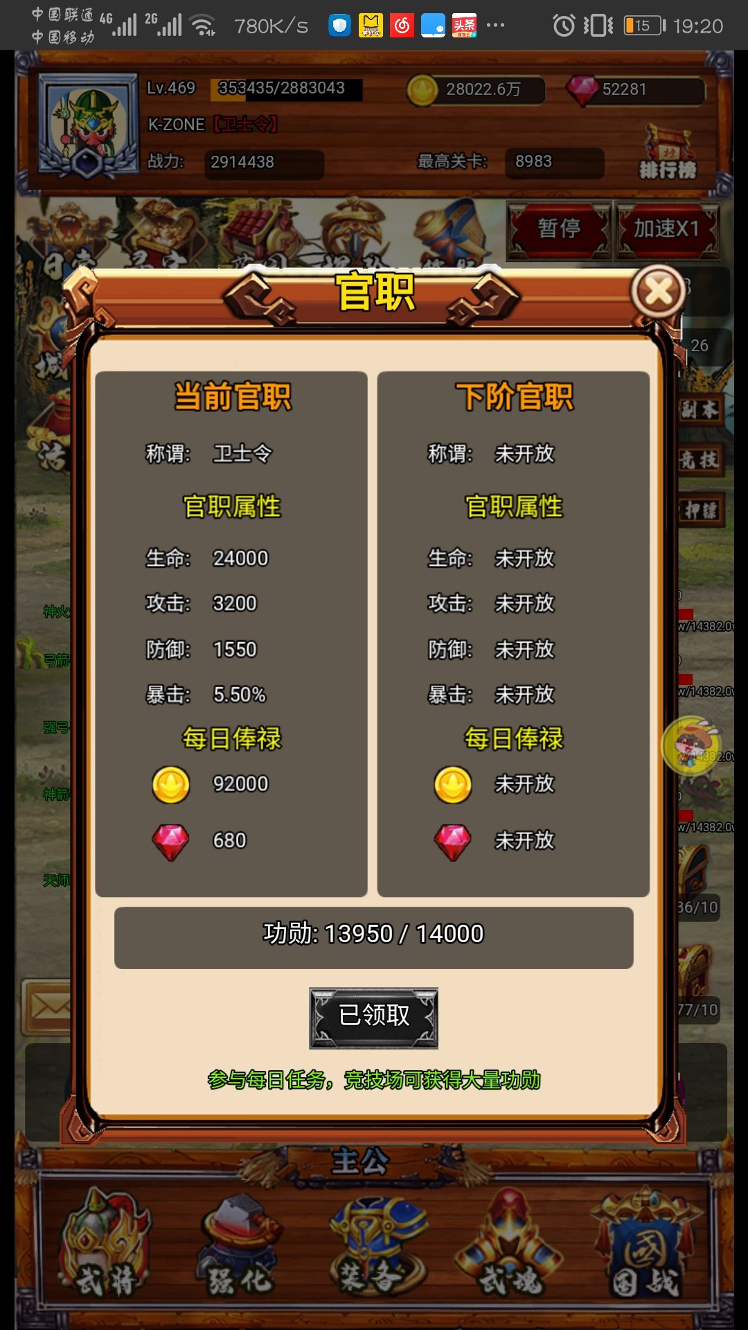 官阶通过功勋进阶,功勋通过日常任务,竞技,和国战贡献以及国战boss获得。进阶一级不单会强化武将全面属性,还能每天领取金币和钻石每阶相应递增(所以有得升就得赶紧升,给个小提示,觉得快要升级了就等升了再领,一天只能领一次)