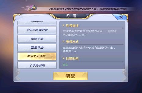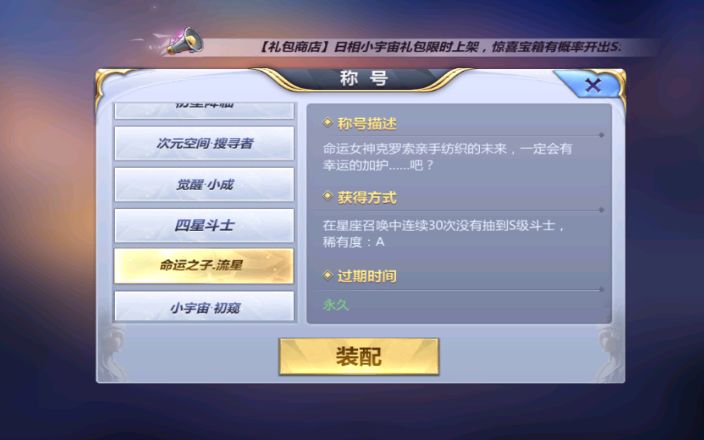 当你连续三十次都没有抽到S级斗士的话,对于非洲玩家,我们也准备了一个称号-命运之子·流星。哈哈是不是特别有趣呢,游戏里还有很多这样的称号哦,快来探索吧