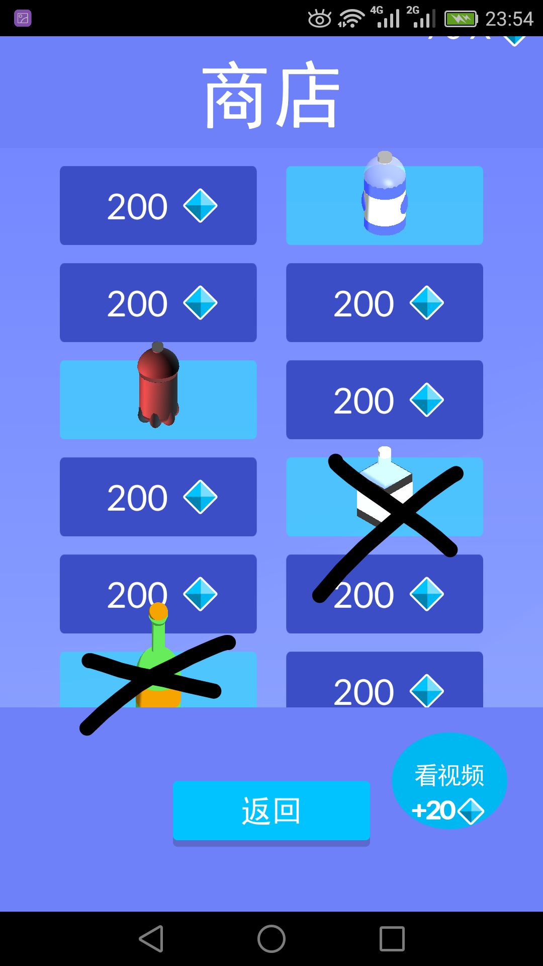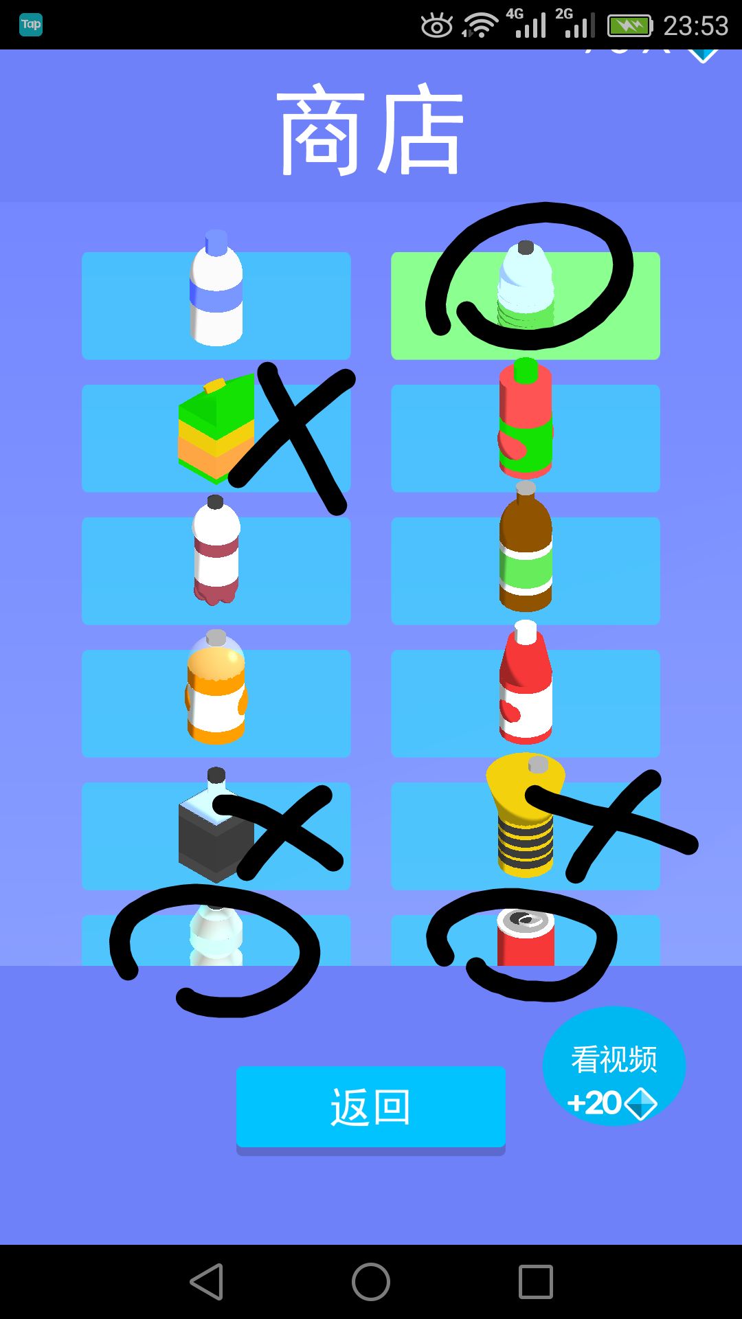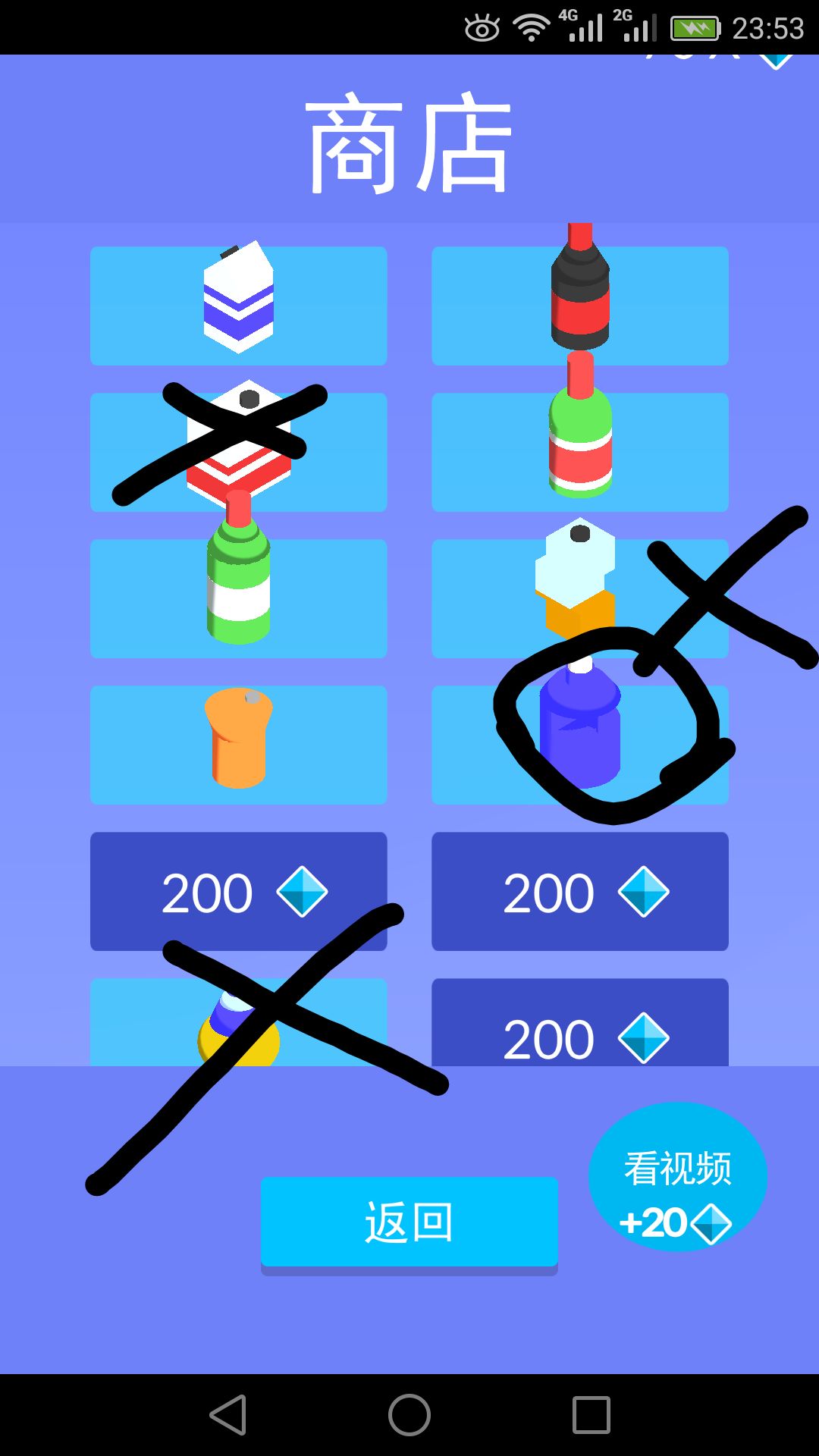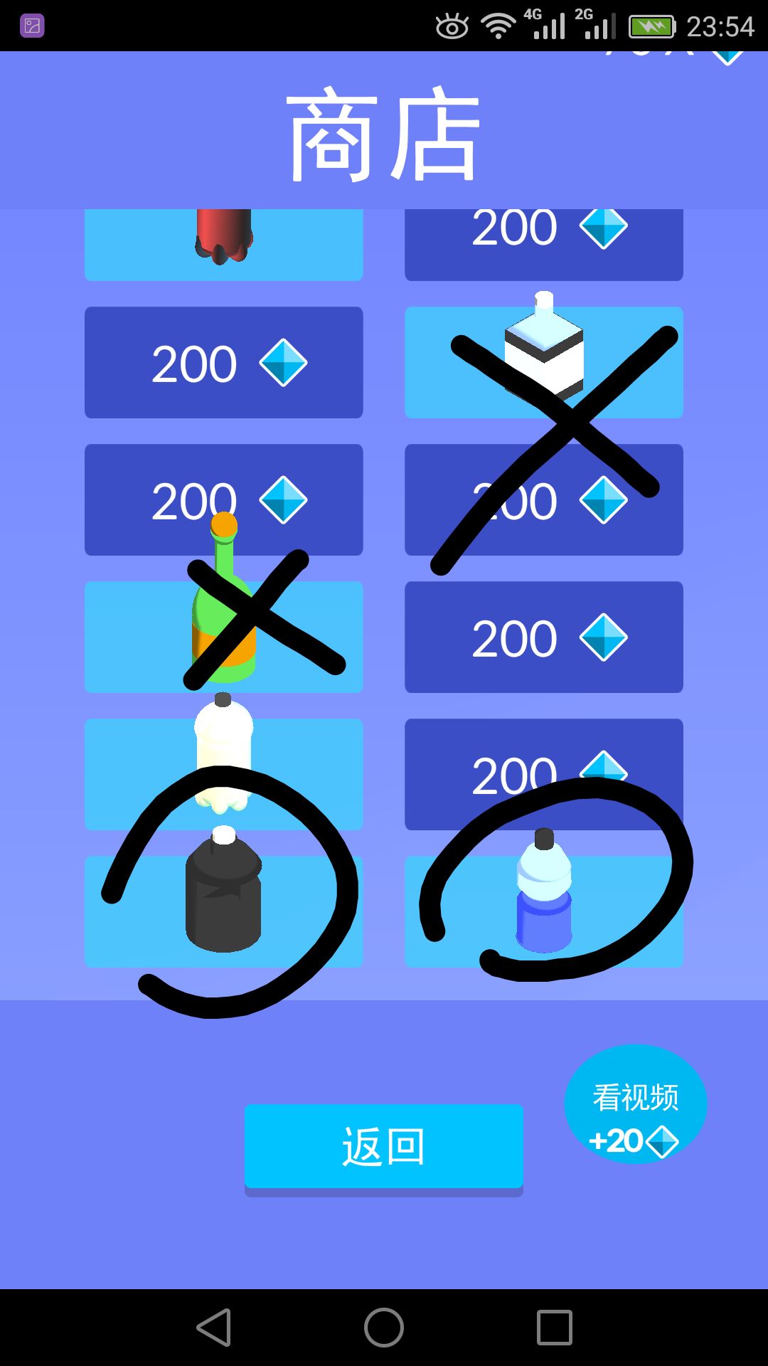 紫色的胖瓶子我通常用來吃獎勵的鑽石和砸保齡球。左下那個瓶子最不推薦用,我感覺不容易判斷下落點。