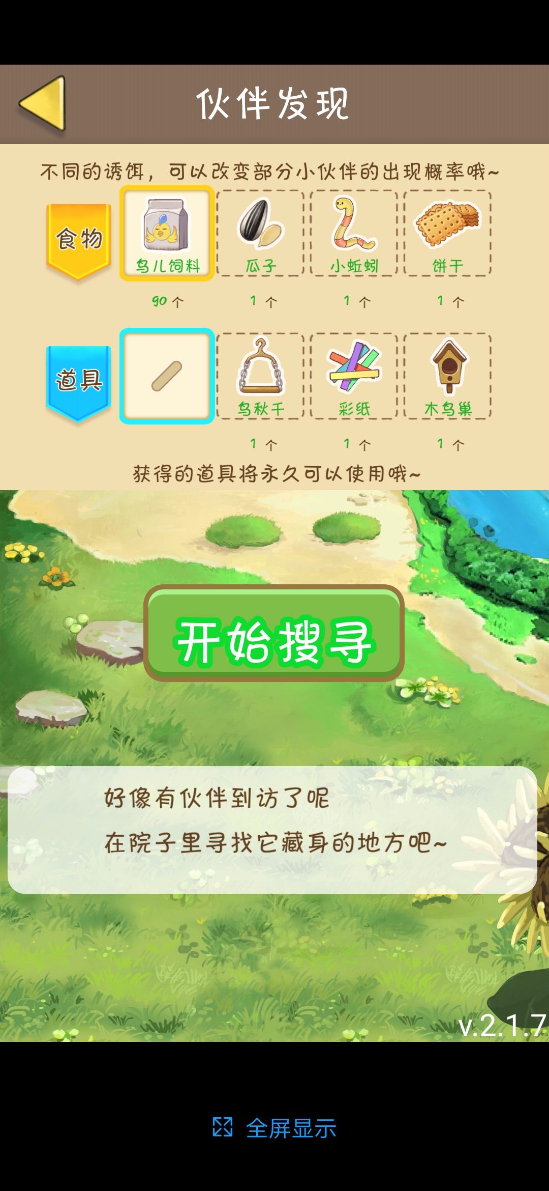 亲测,用不同的食物加道具,真的能收集到不同种类的“伙伴”(比如“蚯蚓+彩纸”收集到鸳鸯的概率最高。)