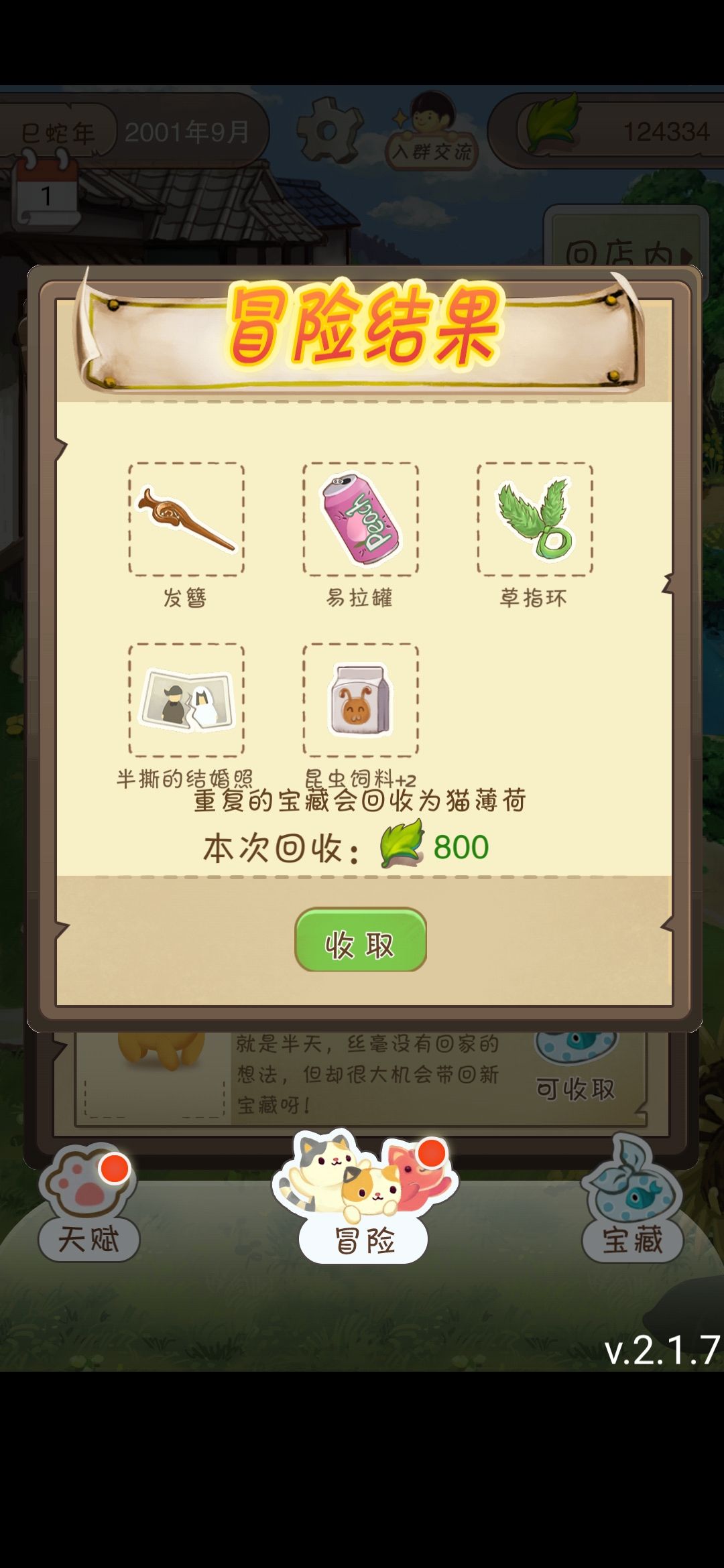 4/点击第1/2只猫的“可收取”,这个时候立即点击第3只猫的“可收取”。会发现第1/2猫所带回来的“猫薄荷”的和数量没有增加到右上角。∠( ᐛ 」∠)_