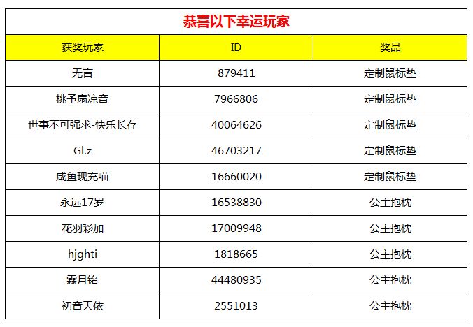 以下是赢得定制抱枕or鼠标垫的幸运玩家名单: