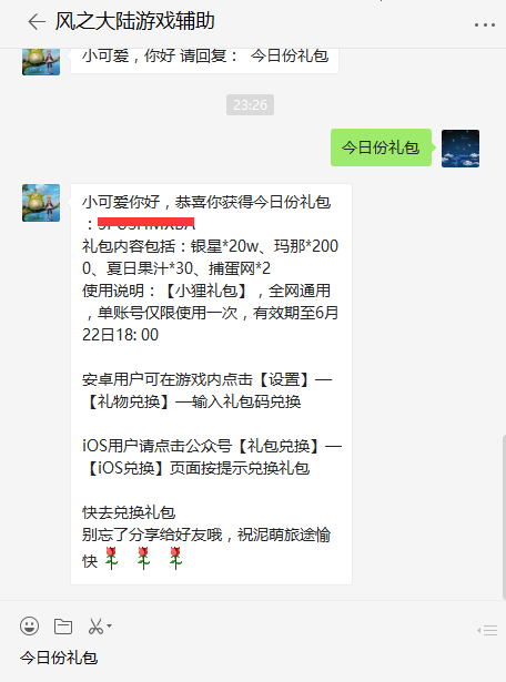 最后,为泥萌送上今日福利。请在公众号(FZDLYXFZ)输入“今日份礼包”,即可获取今日的小狸礼包:银星*15W、玛那*3000、大银豆*1,操作如下图所示, 注意:不是留言是【回复】