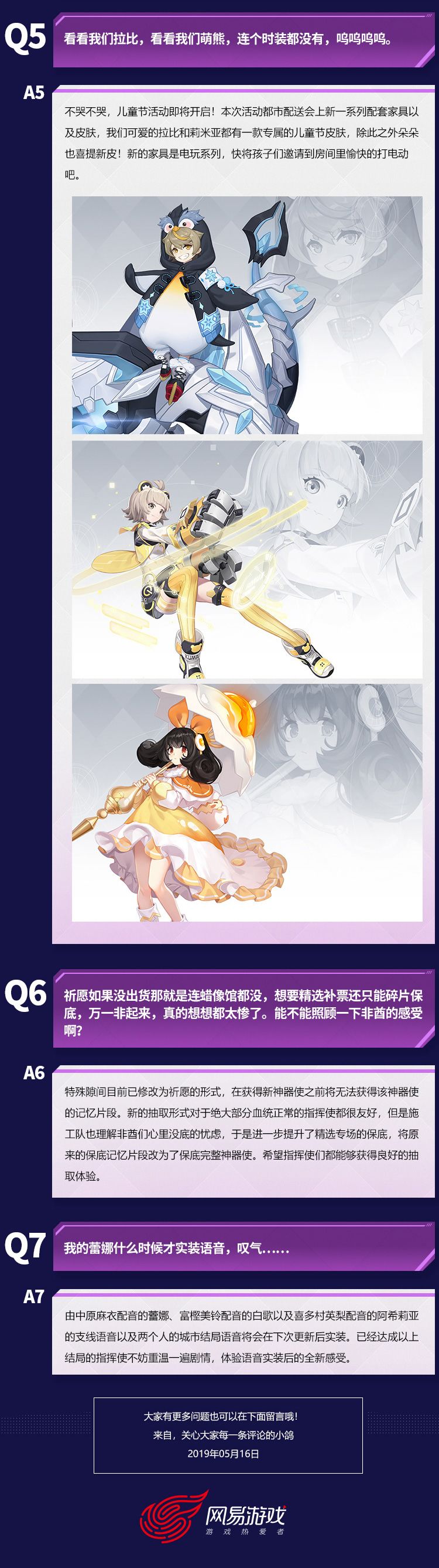 大家久等了!小鸽饲料站新鲜出炉!咕咕咕——六一儿童节快到啦,都督今天带来了拉比、莉米亚、朵朵的儿童节专属时装图透,还给大家送上了新觉醒神器使的情报,对于指挥使们关心的精选专场保底的问题,小鸽也做出了回应哦!想要了解更多饲料站内容,赶紧戳图了解吧~