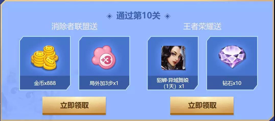 玩家只需成功闯过指定关卡,即可领取《王者荣耀》海量钻石、英雄皮肤体验卡,或《消除者联盟》对应的金币道具等奖励。