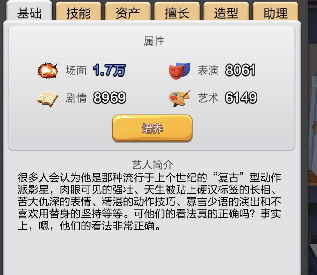 基础栏内为玩家具体介绍了该艺人的属性值,并从属性值的大小可以直观的感受到该艺人的主副属性。以狼叔为例,主属性场面,副属性艺术。每位艺人还会配备由策划小哥精心撰写的一段简介,诙谐幽默的笔锋与真实经历相结合,让玩家朋友更深的了解不同艺人的演艺生涯。