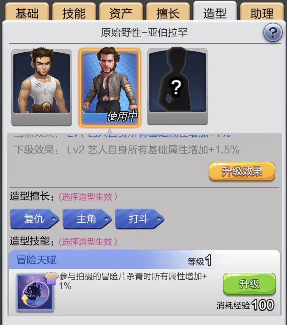 技能栏展示了当前艺人所拥有的技能,从而区分了“站街艺人”“宠儿艺人”“普通艺人”等不同类型。图中冒险天赋技能是当狼叔穿上造型卡后额外获得的一个隐藏技能加成,这个Chen在后续的介绍中会具体说明。