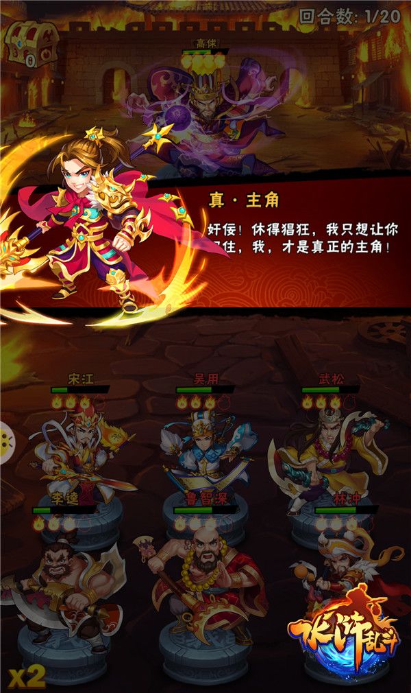 《水浒乱斗》作为一款卡牌手游并不纯粹,它将《水浒传》中许多经典角色移植到游戏中,成为武将卡牌。与此同时,也让玩家扮演一个路见不平的全新侠义角色,亲身感受水浒故事中的爱恨情仇,奇闻异事。由于主角的加入,水浒故事也发生了些小改变,剧情发展由你主宰,做名副其实的水浒好汉NO.1。