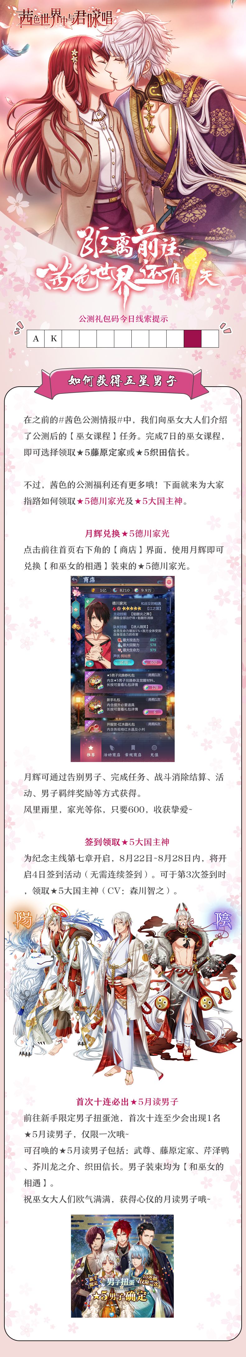 【如何获得五星男子】在之前发布的情报中,我们已向巫女大人们介绍了【巫女课程】可以获得的5星男子,今天就为大家介绍如何获得★5德川家光(CV梶裕贵)以及★5大国主神(CV森川智之)!~