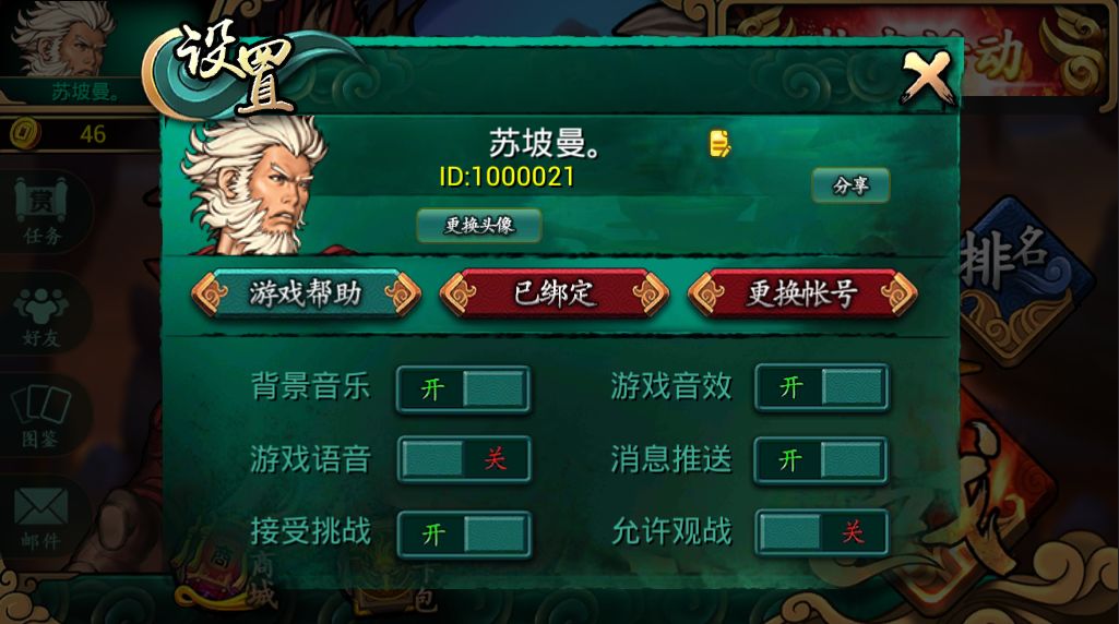 功能:可以查看自己的ID。修改昵称(需要200通宝,好黑!!!!!!)以及进行各种设置。这里着重说一下游戏帮助,这是新手了解这个游戏最快的途径,在里面你可以看到卡牌介绍,对战规则,关键词等,强烈建议新手花时间去了解一下。